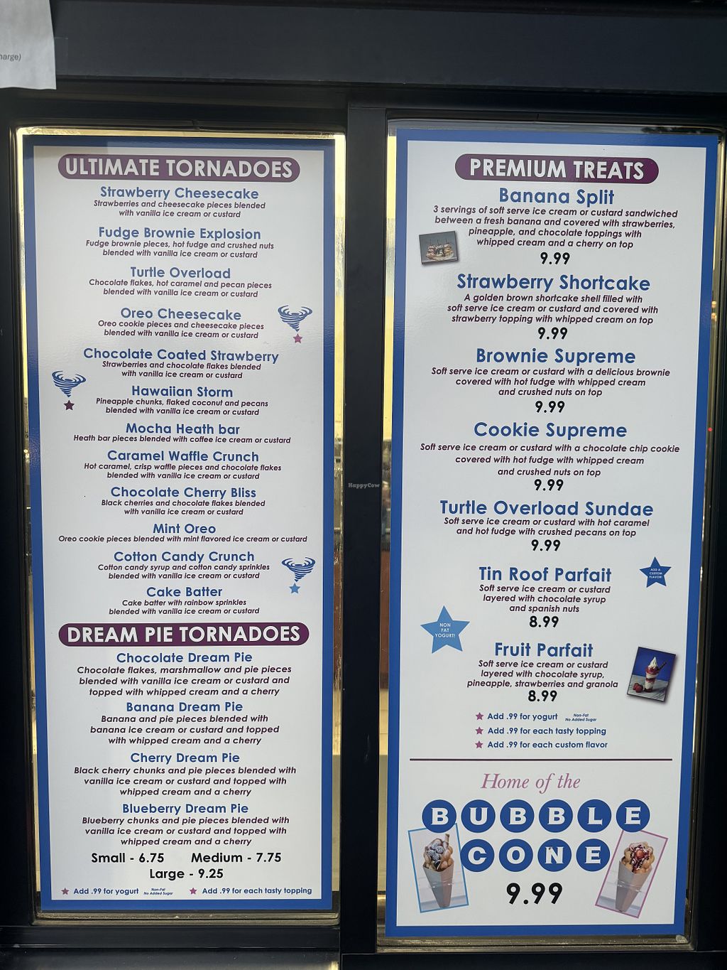 I love that they just don't serve vegan soft serve but allow u to get "tornadoes" (blizzards) with it as well. I'm not sure if the vegan soft serve cost more (hope it doesnt) and I haven't seen a sign saying it does. The total for two small tornadoes was $18 and I'm confused why it was so much. So hopefully the vegan option doesn't cost more.