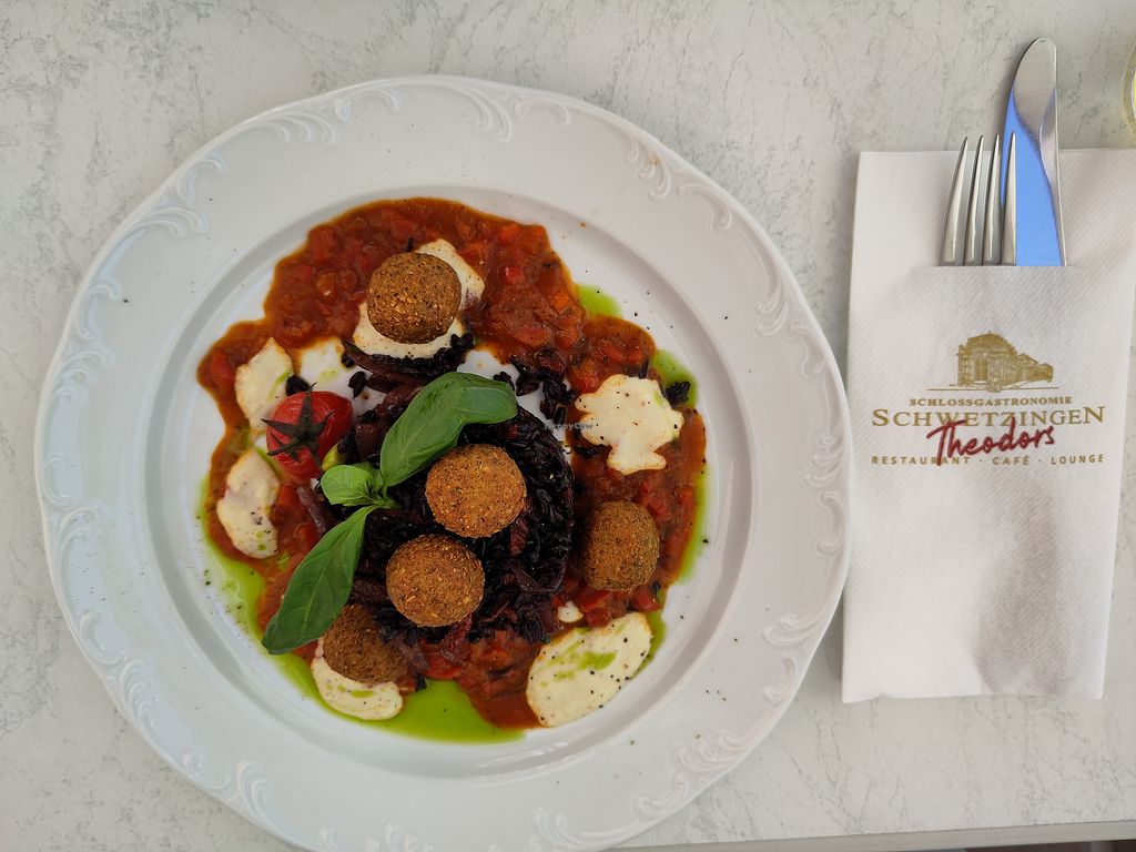 Gorgeous, fancy restaurant inside the Schwetzingen castle grounds with clearly labeled vegan options (one starter, two mains, and a dessert).