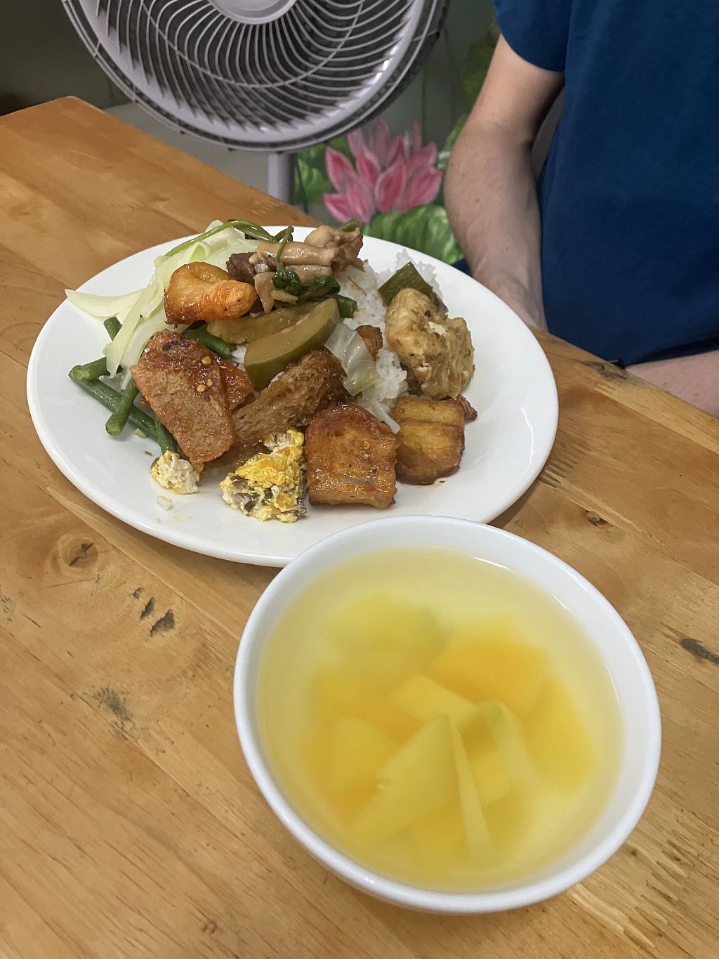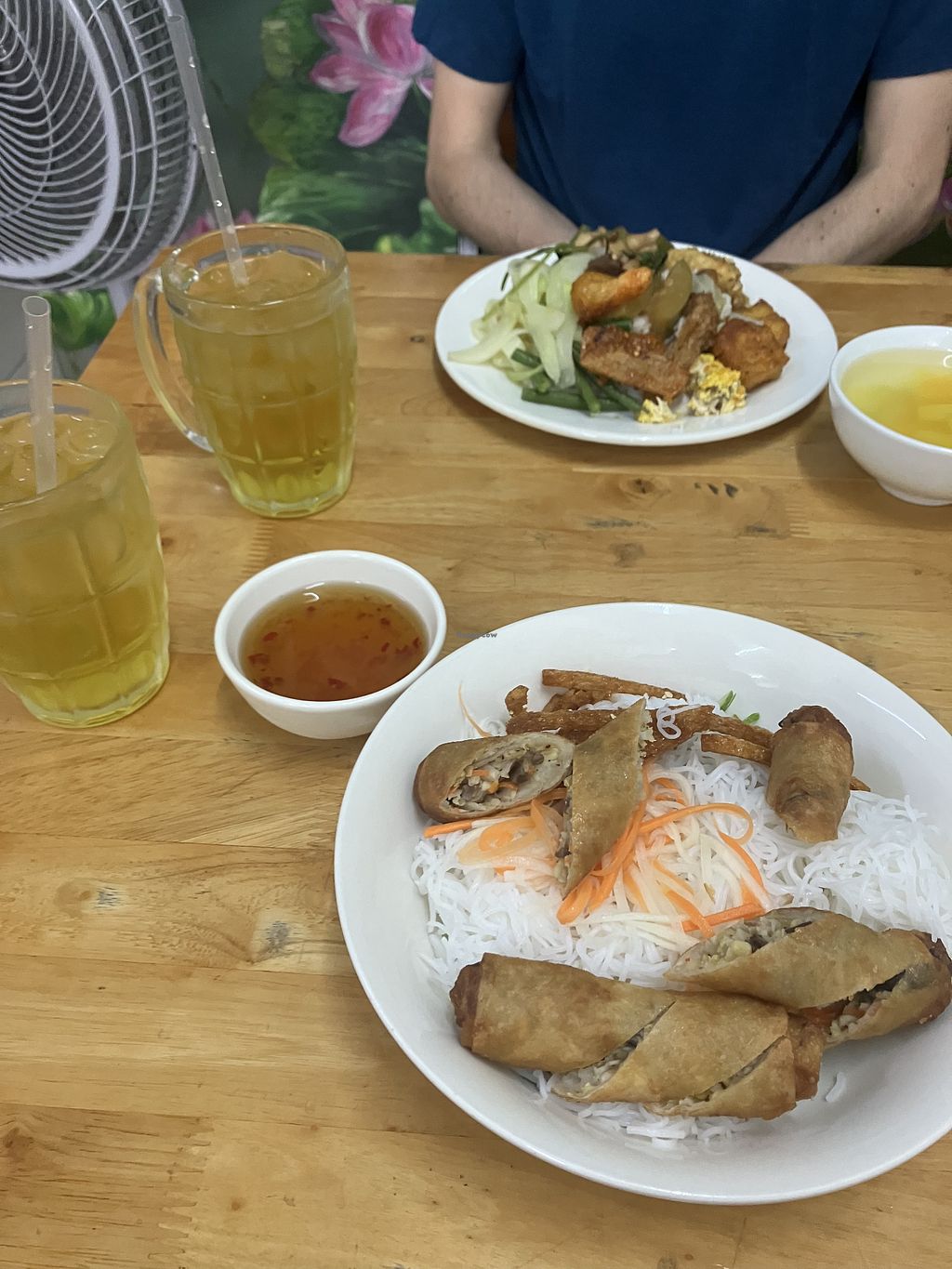 Local com chay with a range of precooked foods and soups, most of which are vegan. Note the pancakes contain egg and some drinks contain dairy. Open Mon-Sun 6:30am-8:30pm.