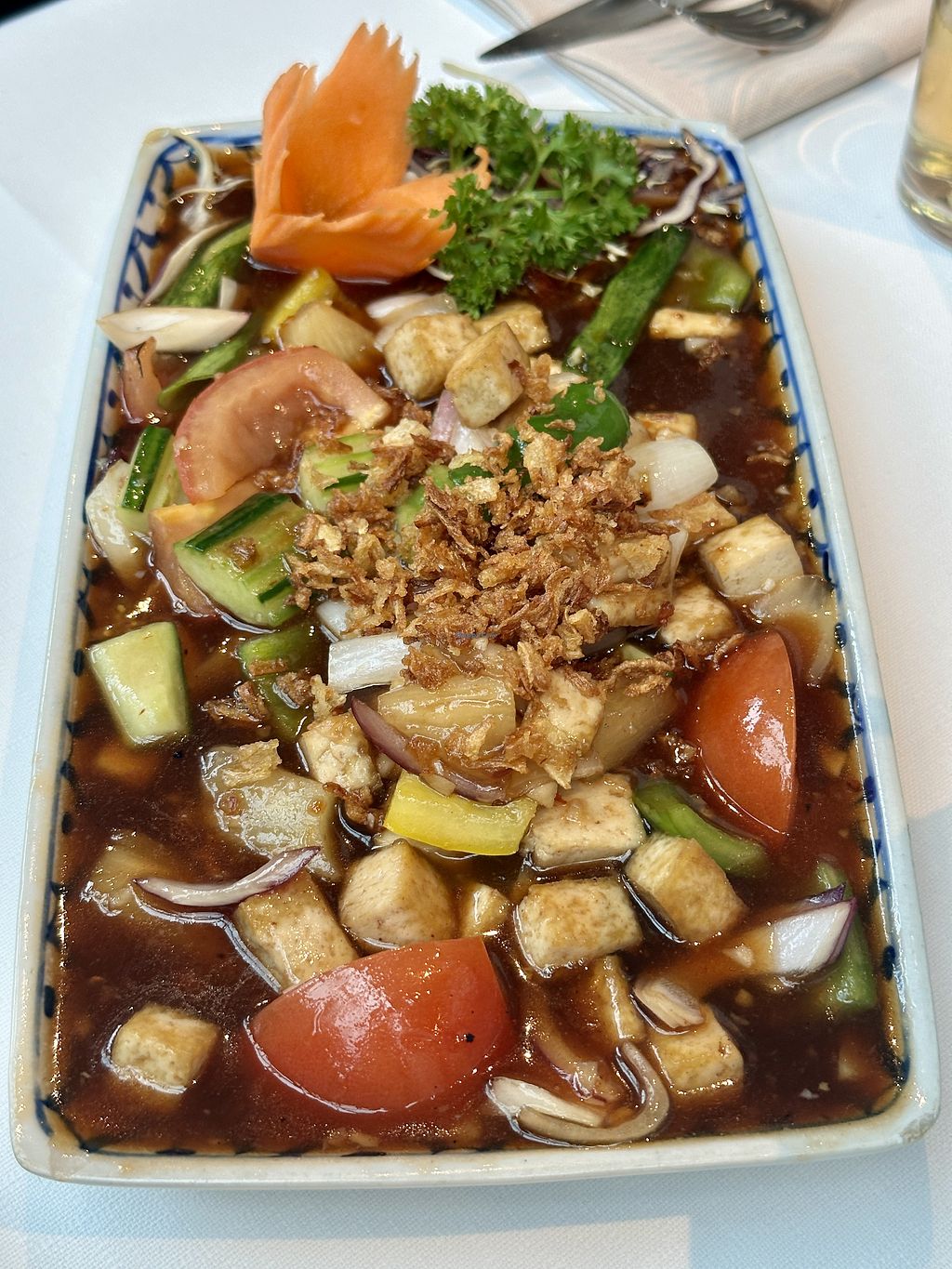 Vegan main dish, vegetables with tofu and a garlic-soy-sauce. christma…