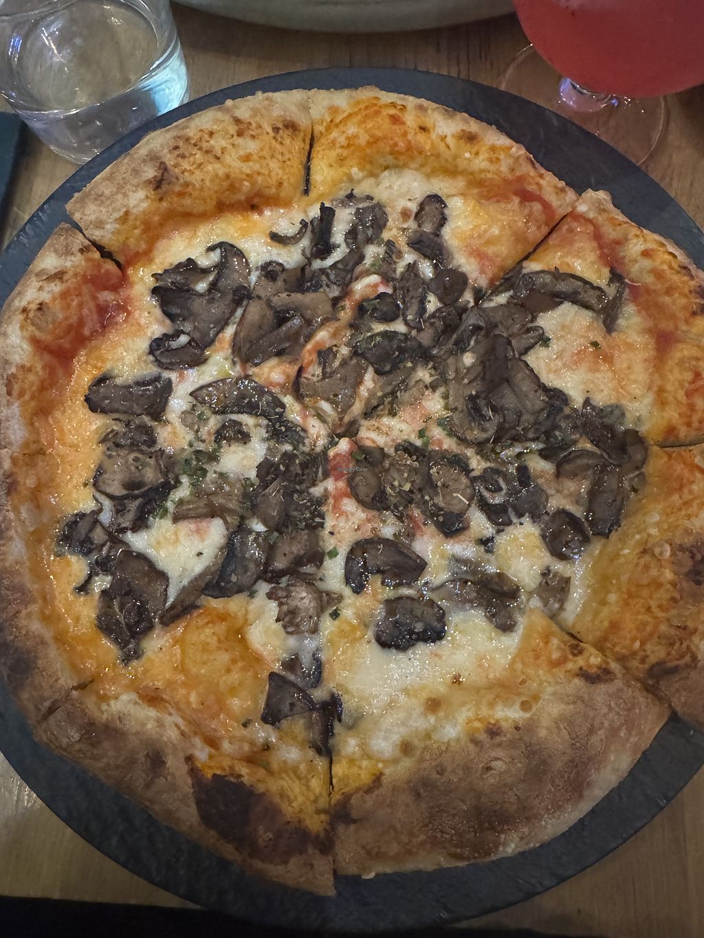 Had the roasted cauliflower as starter (which was delicious) and then mushroom pizza with vegan cheese. Not that many other vegan options, but the vegan cheese melts really well and is pretty good. The service was incredible. They gave me a free glass of wine because they accidentally made a non-vegan pizza but corrected the error before even bringing it out and it still came out at the same time as everyone else's food.