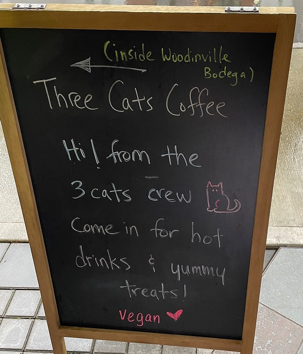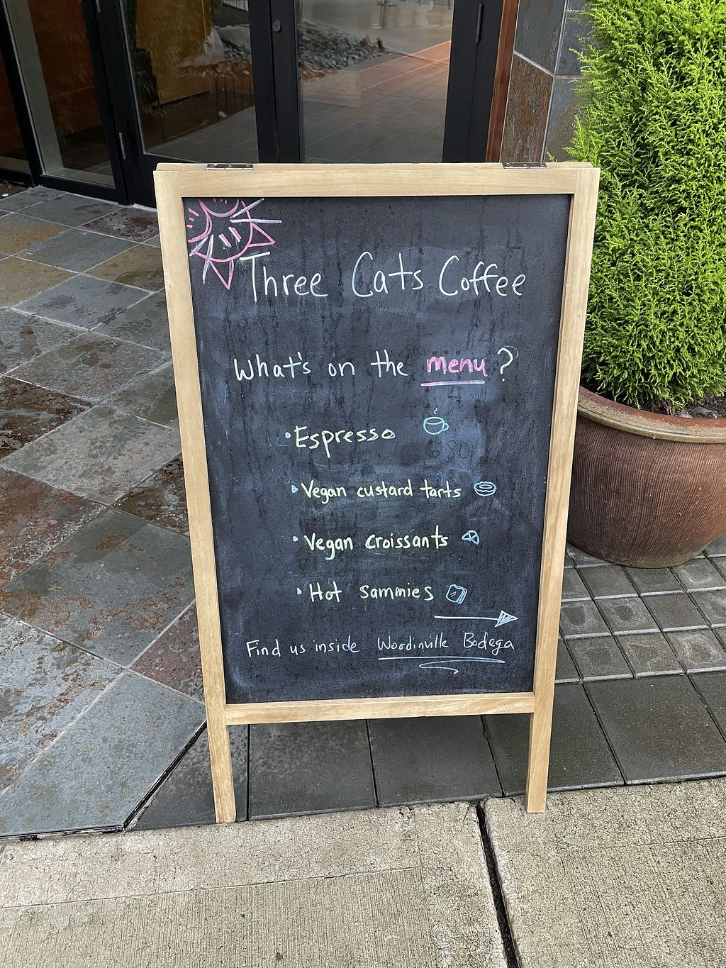 There's a new vegan game in town, they just opened about a month ago and go by the name of .... Three Cats Coffee, based in Woodinville.