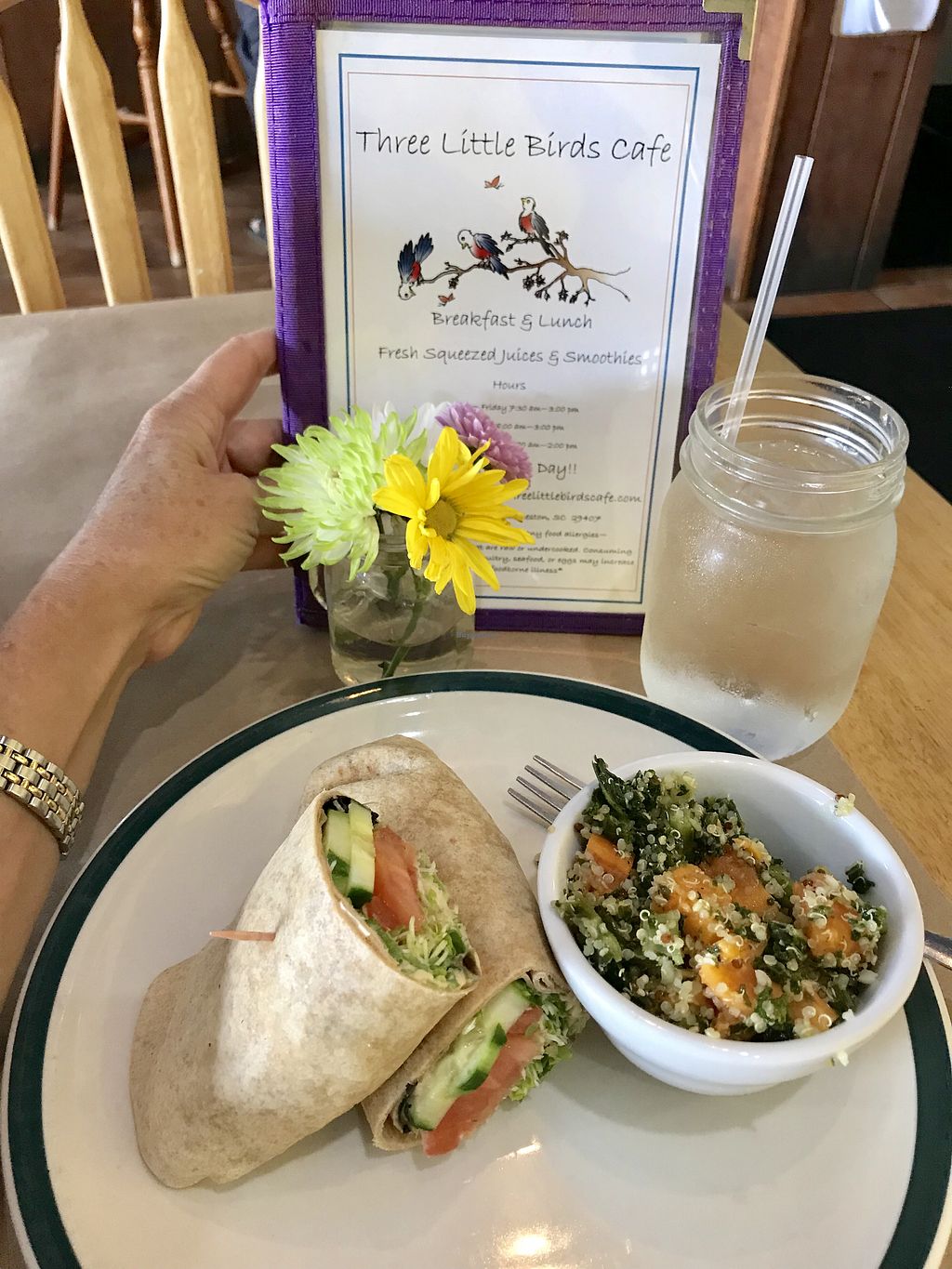 We had a smoothie, BBQ Tempe, hummus veggie wrap with a quinoa side and broccoli! All was delicious and they were very accommodating to our plant based requests.