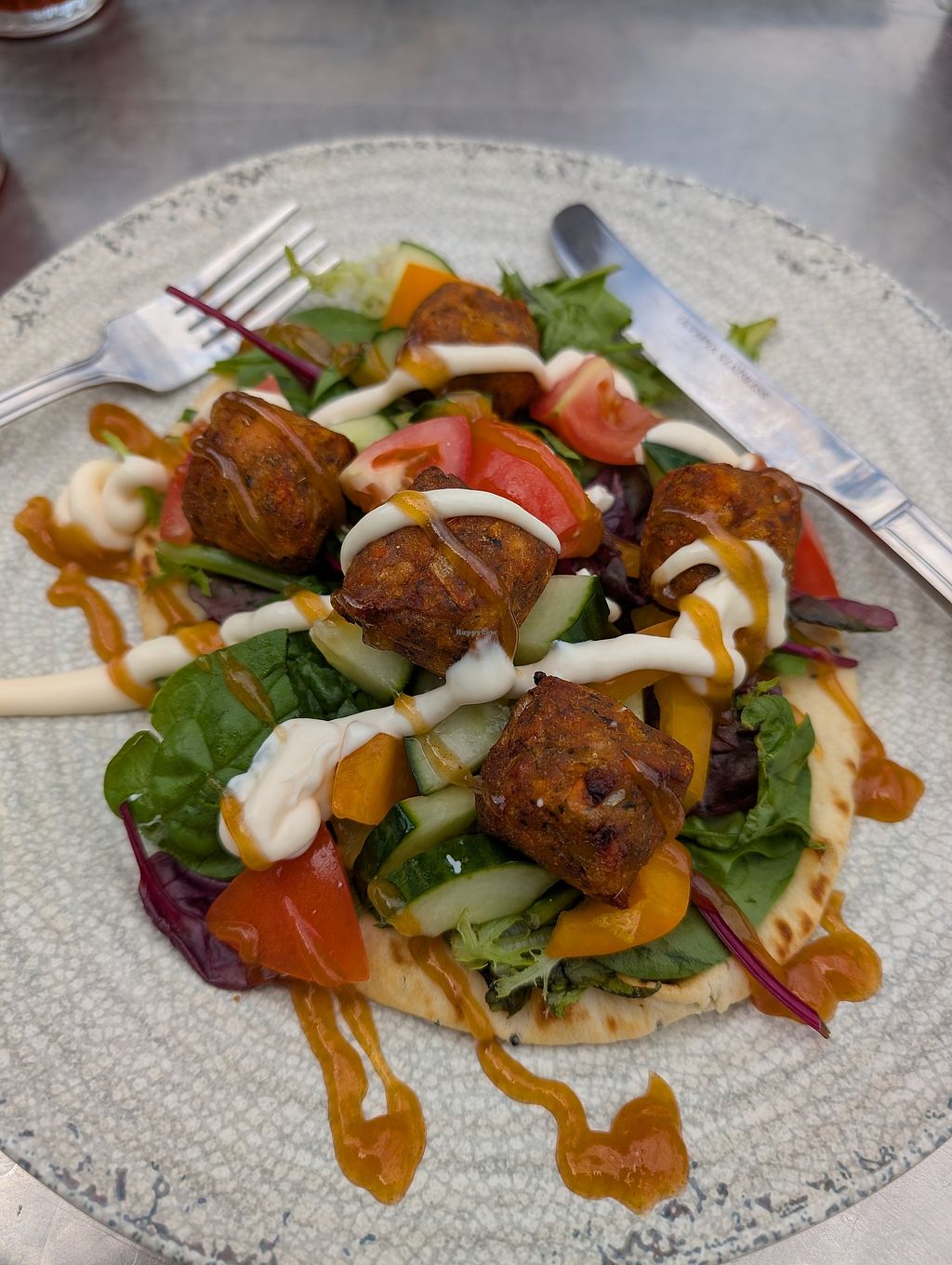 A few options for vegans. A cob (mushroom and hash brown) and sweet potato falafel flatbread.