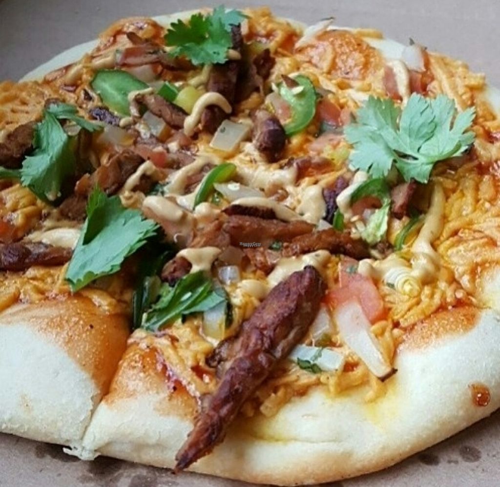 Red Head juice and a pizza with pineapple pico on the side
