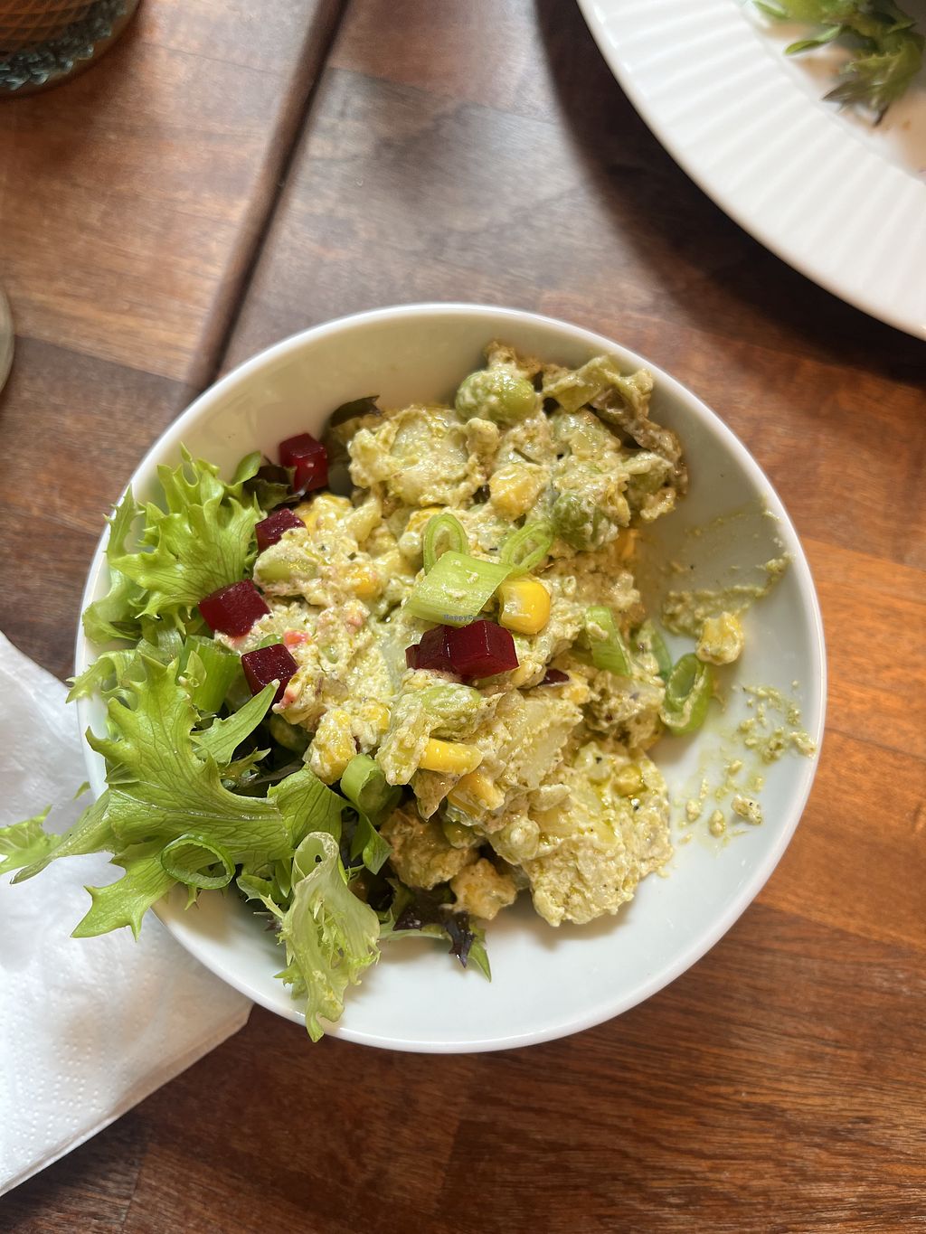 We asked for the vegan dressing for the onion rings, as it came with egg mayo on the menu, but they were happy to swap. The burger and potato salad was vegan without changes