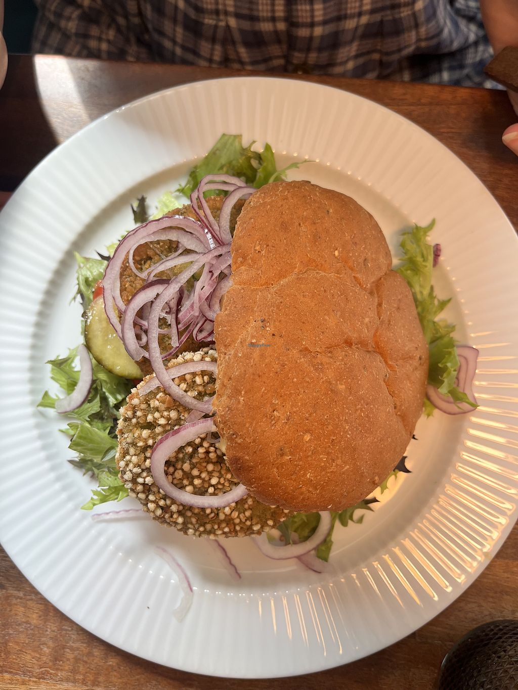 Very nice café with vegan options. The quinoa burger was surprisingly good, I often find them dry and boring, but this was really nice! Comes with a spicy vegan dressing. Potato pesto salad was also really nice, and vegan even though it was not written in the menu. The onion rings were also very nice, but 100 kr for a small portion, was too expensive. We asked to swap the egg mayo for the vegan dressing. Nice staff, would recommend.