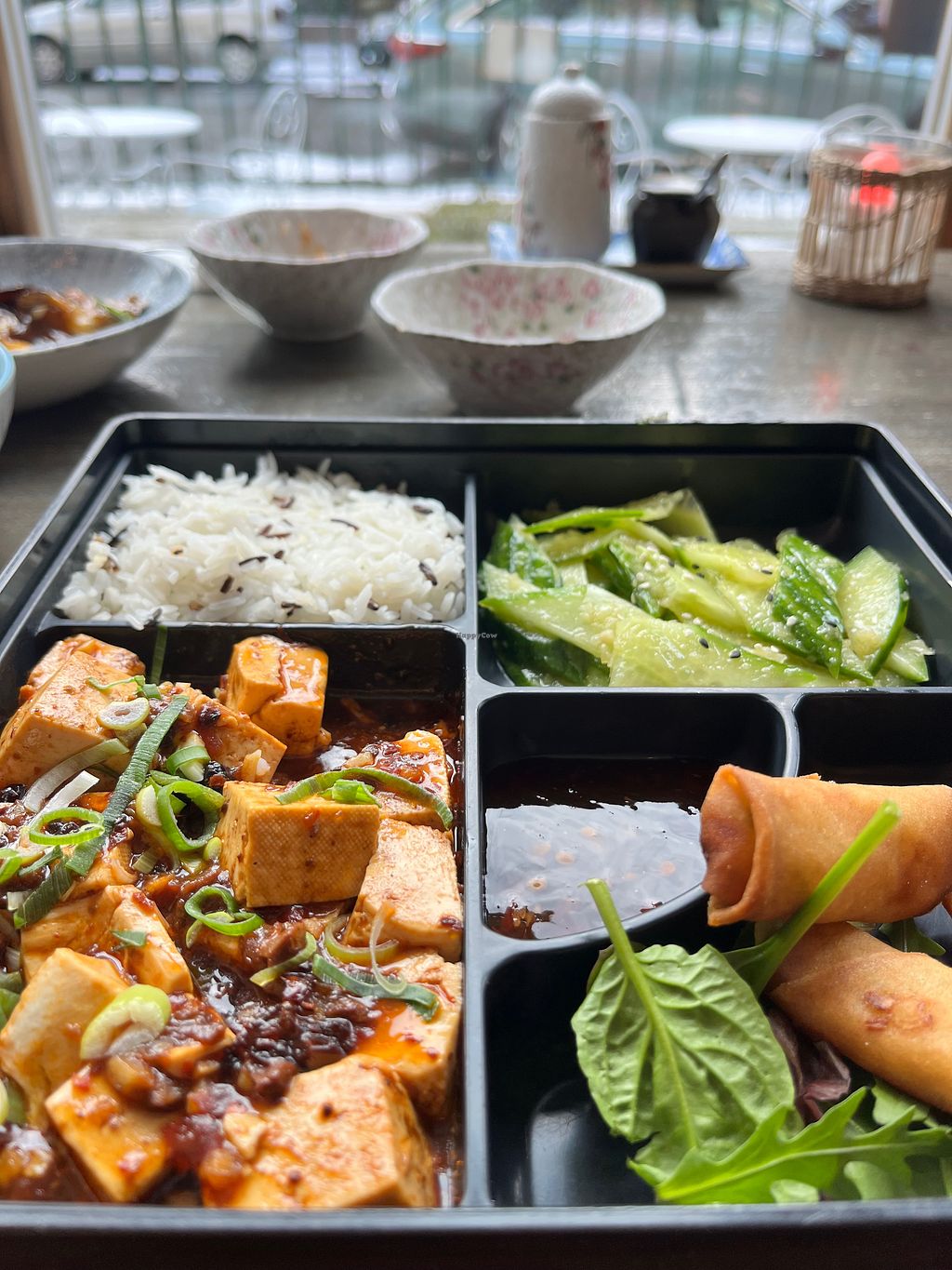 Mapo tofu, spring rolls, cucumber with garlic and chili oil. Lunchbox …