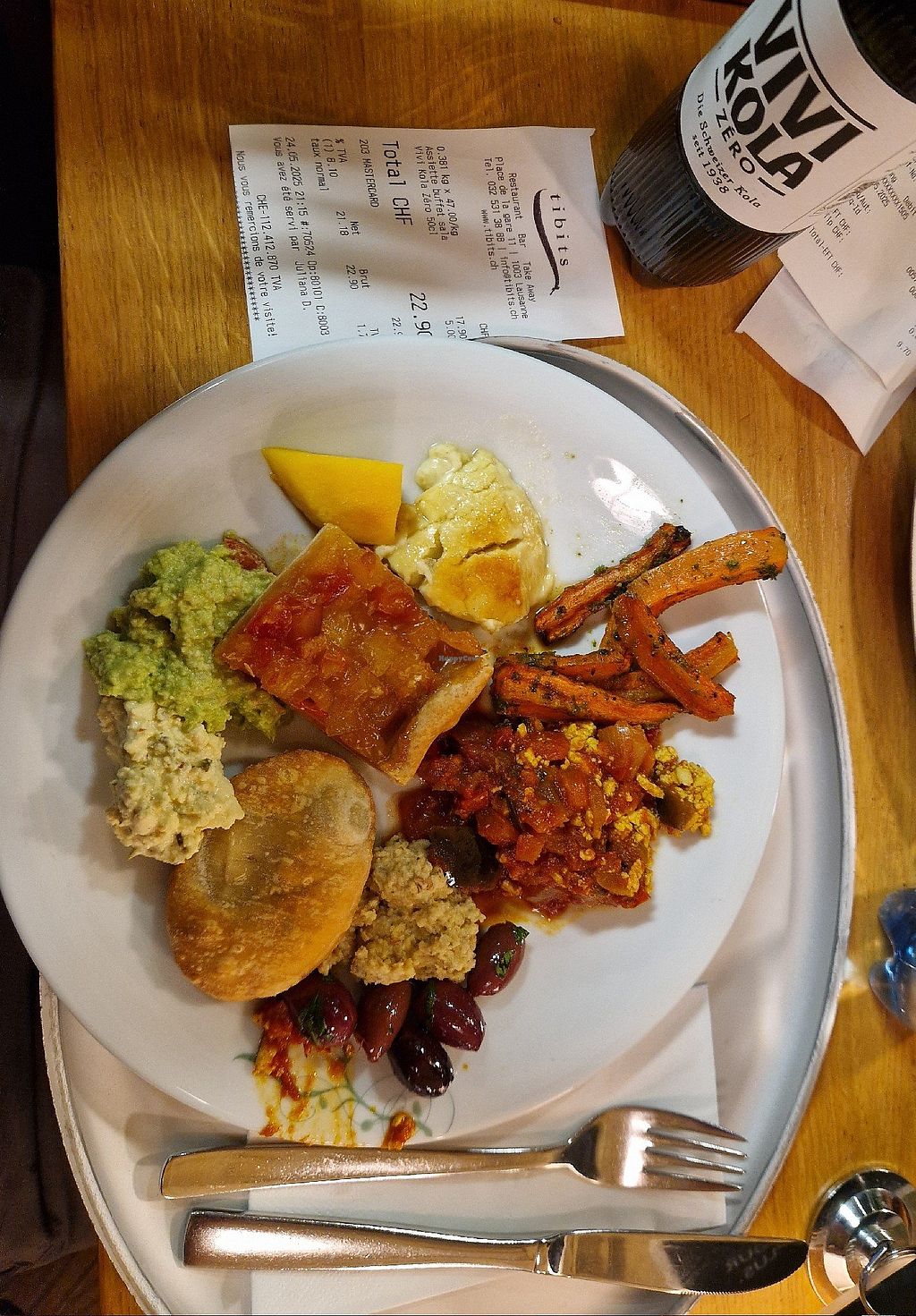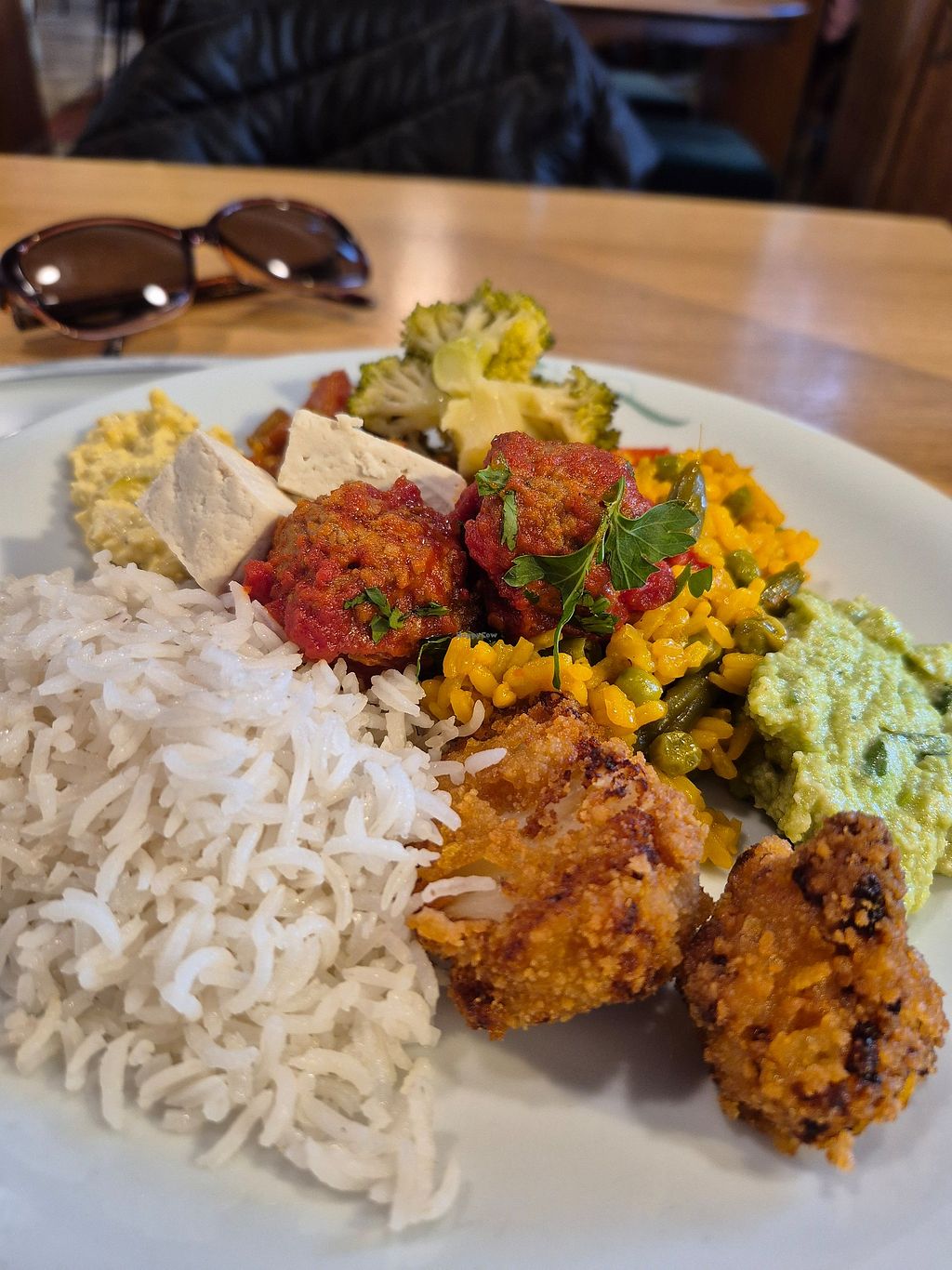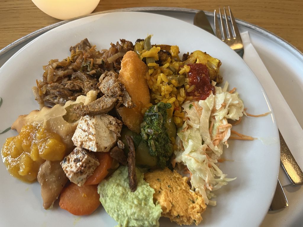 Soy Schnitzel, Broccoli, Potatoe Salad, Beetroot Ball, Cheesecake Salt…