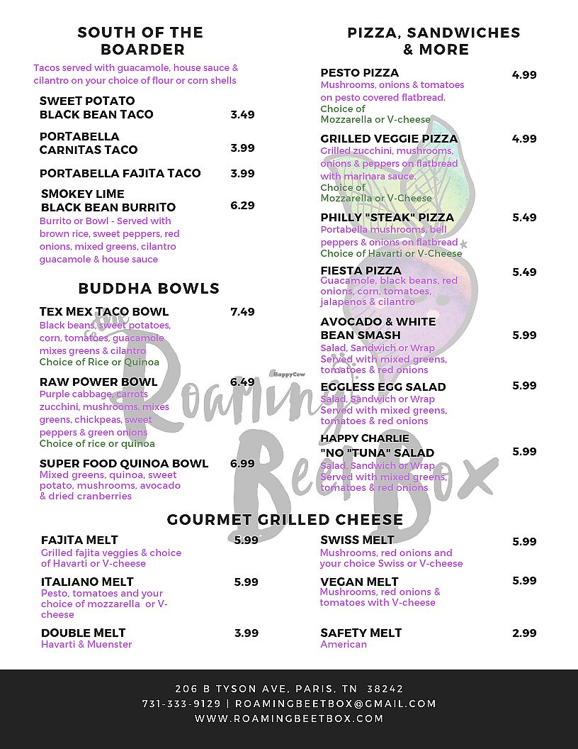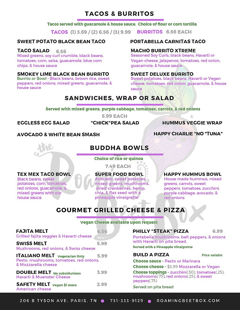 Serves meat, vegan options available. Offers gourmet tacos, Buddha bowls, melts, pizza and sandwiches. Formerly vegan but rebranded April 2022 and added meat to the menu. Formerly called Roaming Beet Box. Reported closed April 2023.