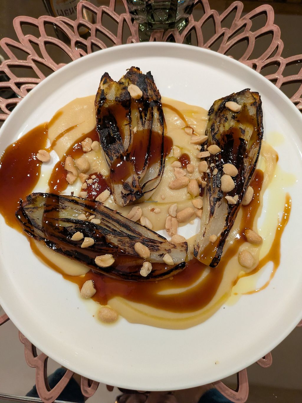 Indivia con arachidi, crema di ceci e aceto balsamico