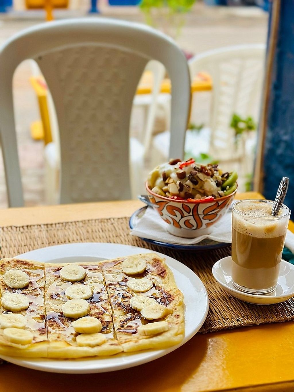 Moroccan pancake with chocolate and banana, and fresh orange juice, an…