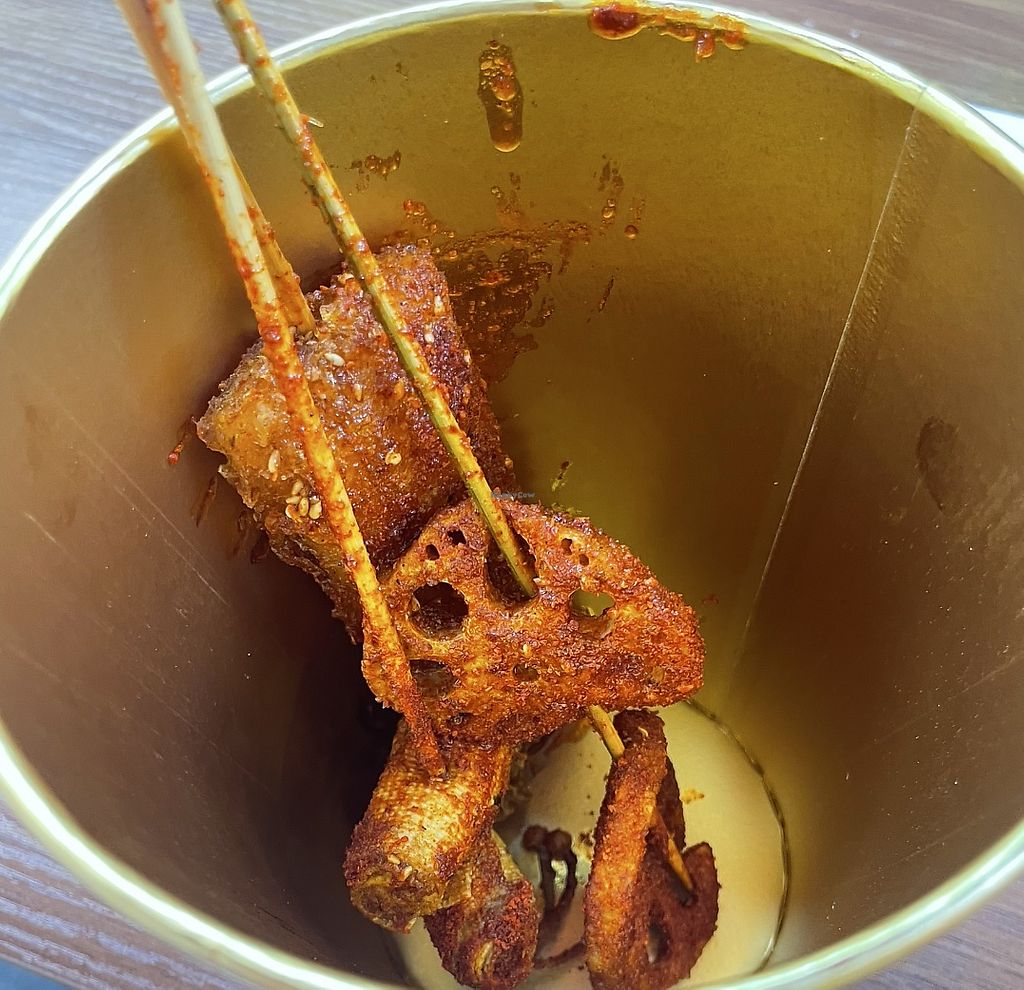 Serves meat, vegan options available. Take-out skewers restaurant offering a few vegan items such as gluten, tofu, rice cake, enoki mushrooms, beans, rice cakes and more. Open Mon-Sun 11:00am-12:00am.