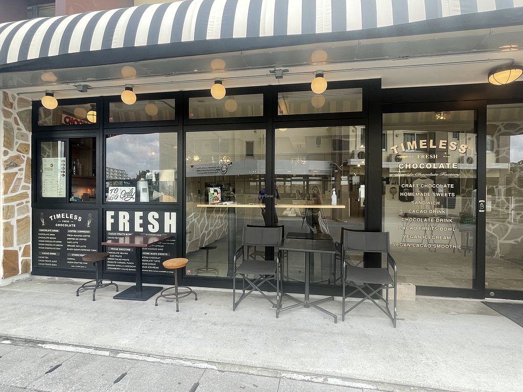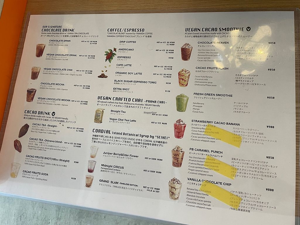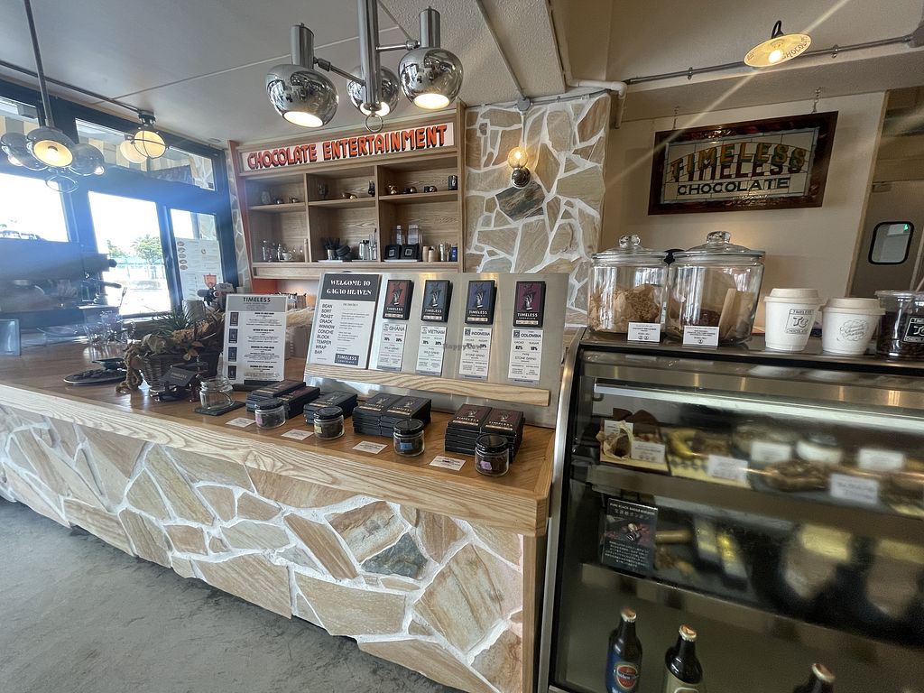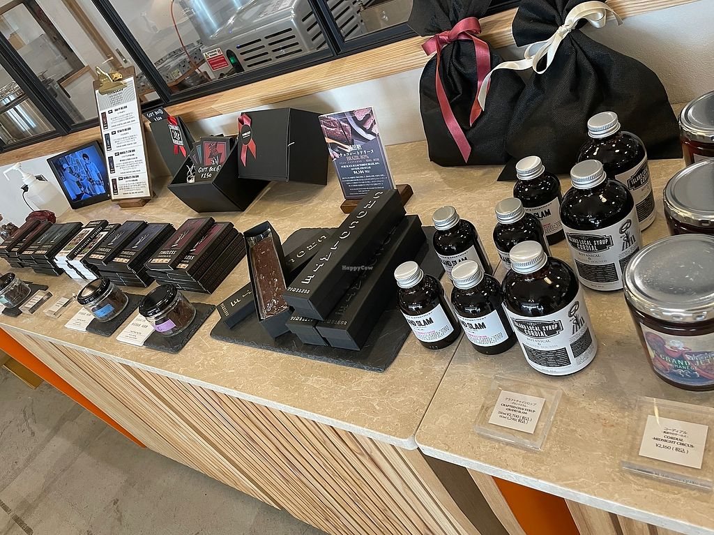 Serves meat, vegan options available. A chocolate factory & cafe offers vegan salad bowls, fruit bowls, sandwiches with hummus and falafel, as well as a selection of vegan cakes and drinks. Relocated from 9-46 Mihama, Nakagami District. Open Mon-Sun 11:00am-7:00pm.