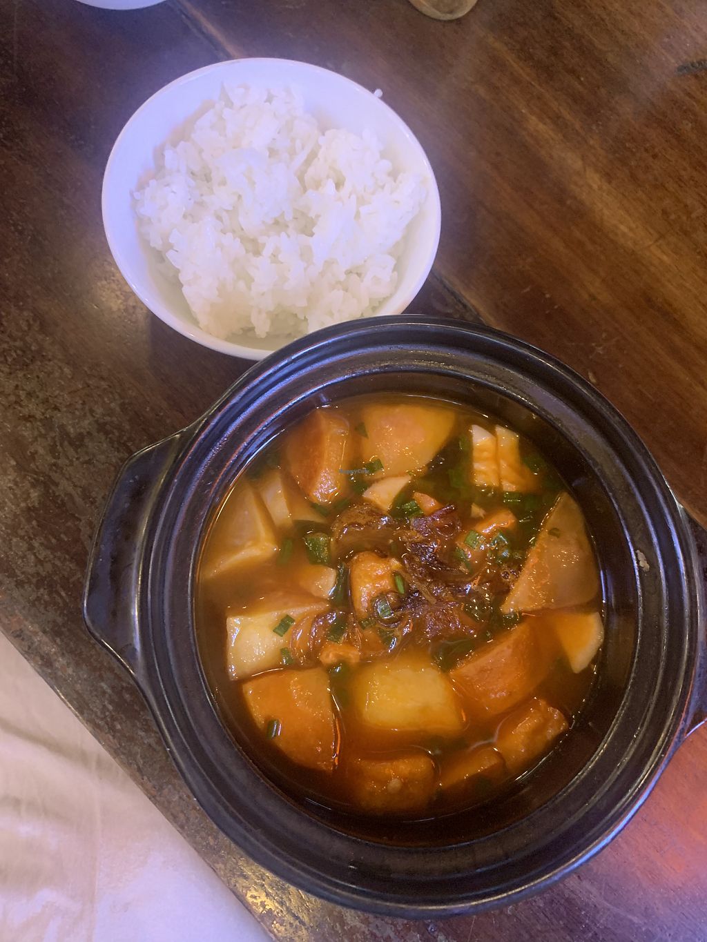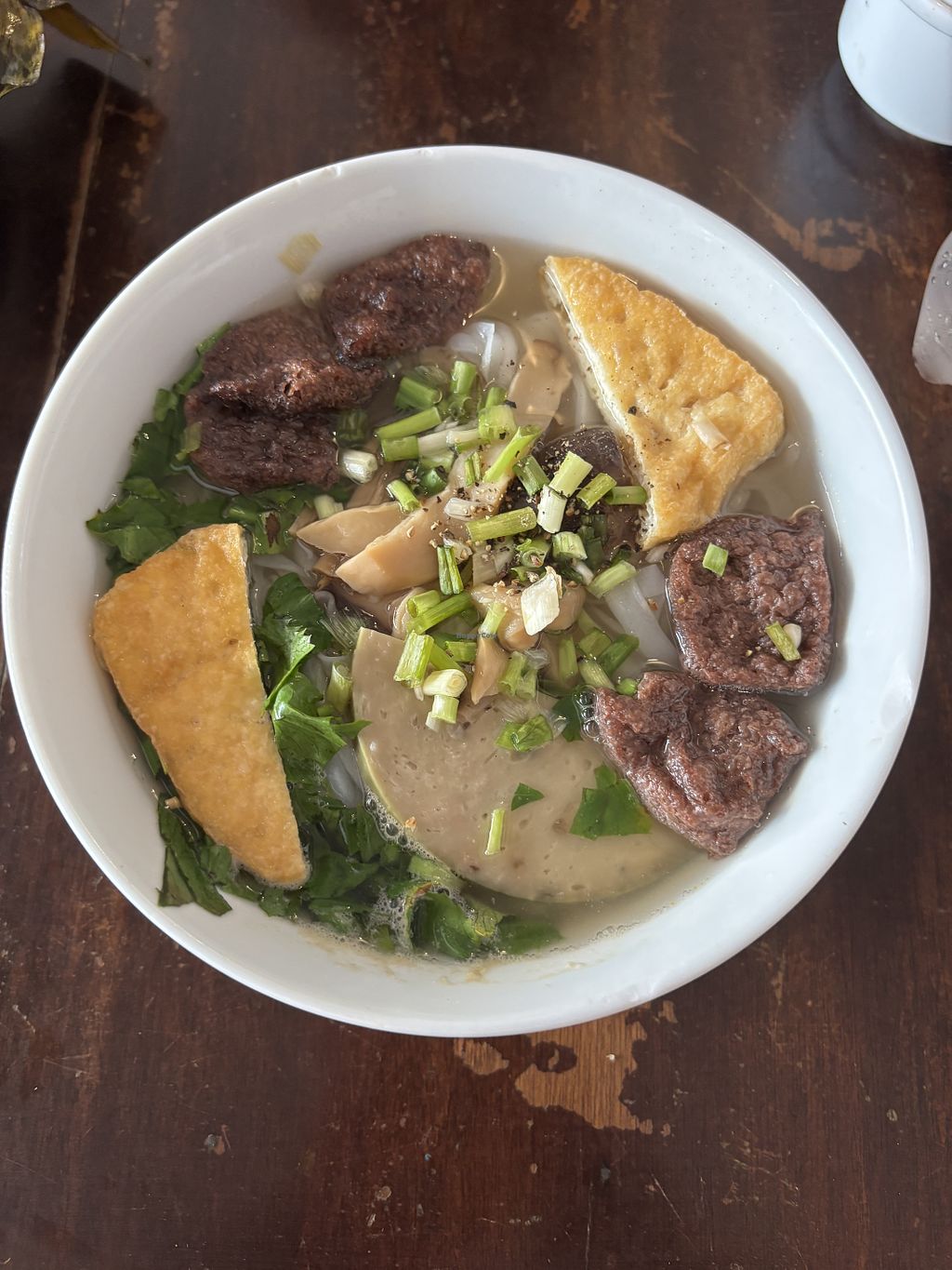 The menu has a lot of choices. I got the Bun Bò Huẽ because… I’m in Huẽ. I’ve seen signs for this dish more than any other in Vietnam so I had to try it in its place of origin. I’m glad there was a place here that offered the vegan version. Though, overall it’s the most boring noodle soup I’ve had since being in Vietnam. I’m annoyed that I was dissuaded from coming here by the recent reviews complaining of 8% tax. For me that was like 30¢ USD. I also got a mango smoothie, which hit the spot. But what bugged be about this place was the proprietor. My bill came out to $108,00vnd, I handed $109k because I had some $5000 and $2000 bills. She tapped my stack of bills and either said “ten thousand” or “one thousand” like I hadn’t given her enough. I took my stack back and spread it out on the table to double check and show her. I had a really long day but am now familiar with the currency and was certain I gave her enough. Then she said “ok!” and gave me my $1000 change. I’m not sure what kind of misunderstanding we were having but I feel that she was hoping that I would give her a larger bill. This is the only time in Vietnam where I felt someone was acting questionable. When I first got here and didn’t know what I was doing with the currently every person I encountered would correct me honestly. I have no idea what this woman was trying to do.