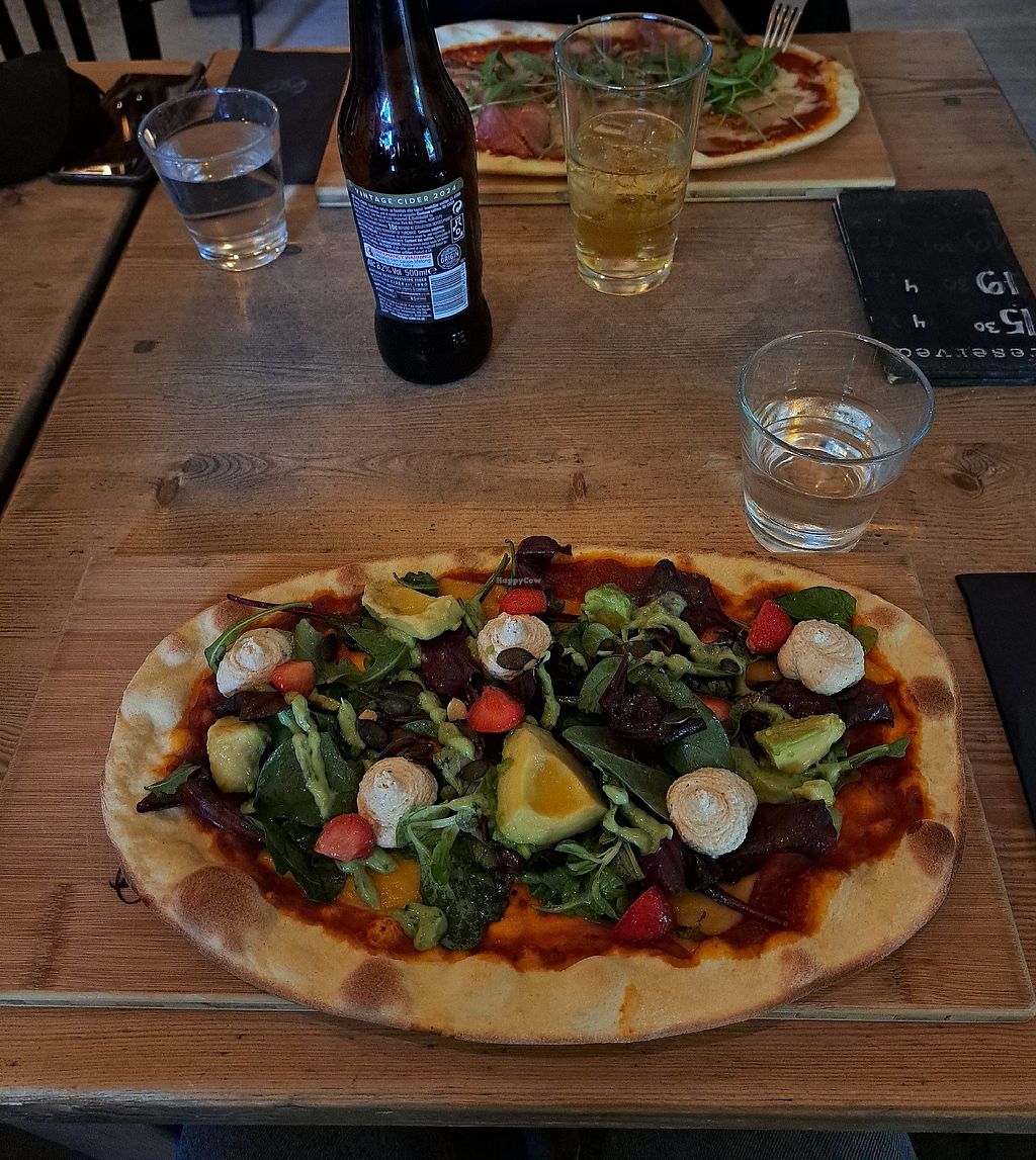 Popular place by the river. Had a vegan pizza with asparagus, smoked almonds and strawberries.
