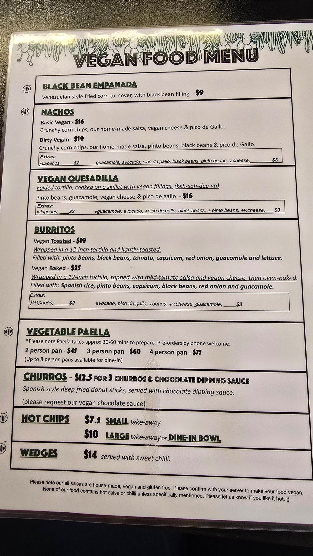 They have a separate vegan menu. You can have Milkshakes, other drinks, quesadillas, burritos, paella, churros, etc. It's amazing & the staff is very friendly as well!