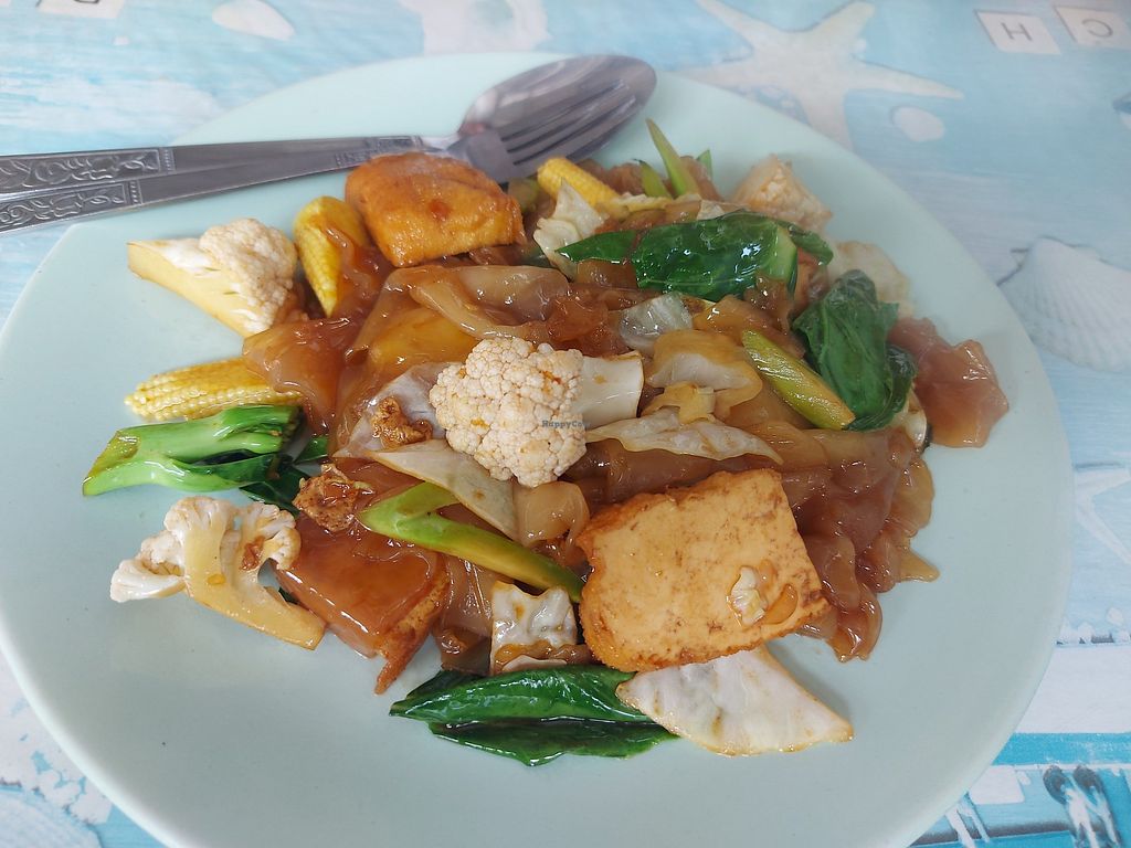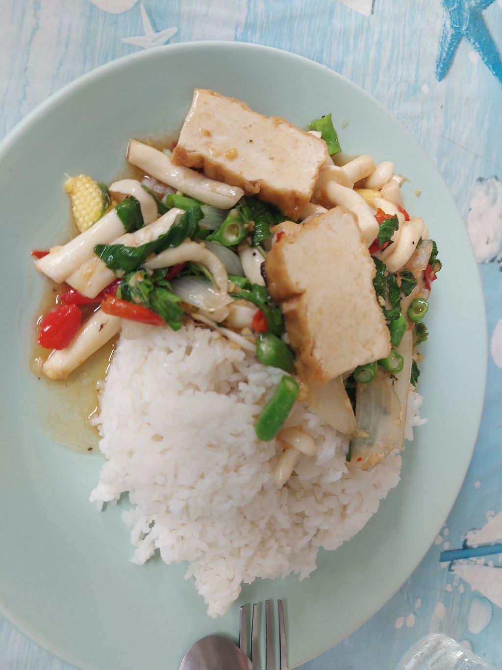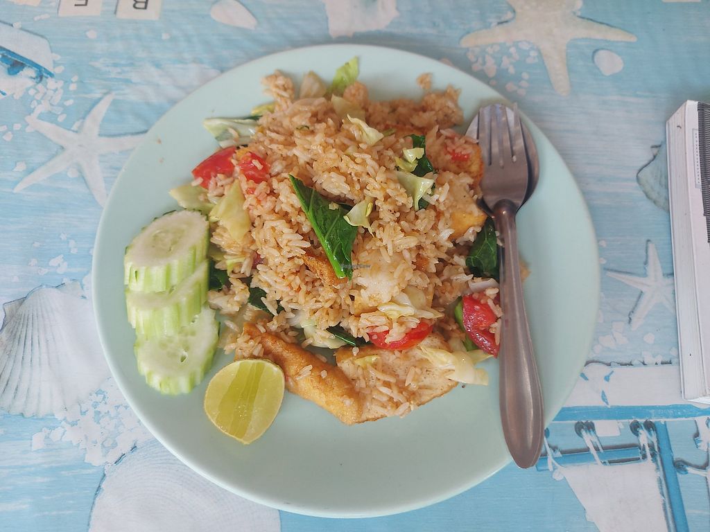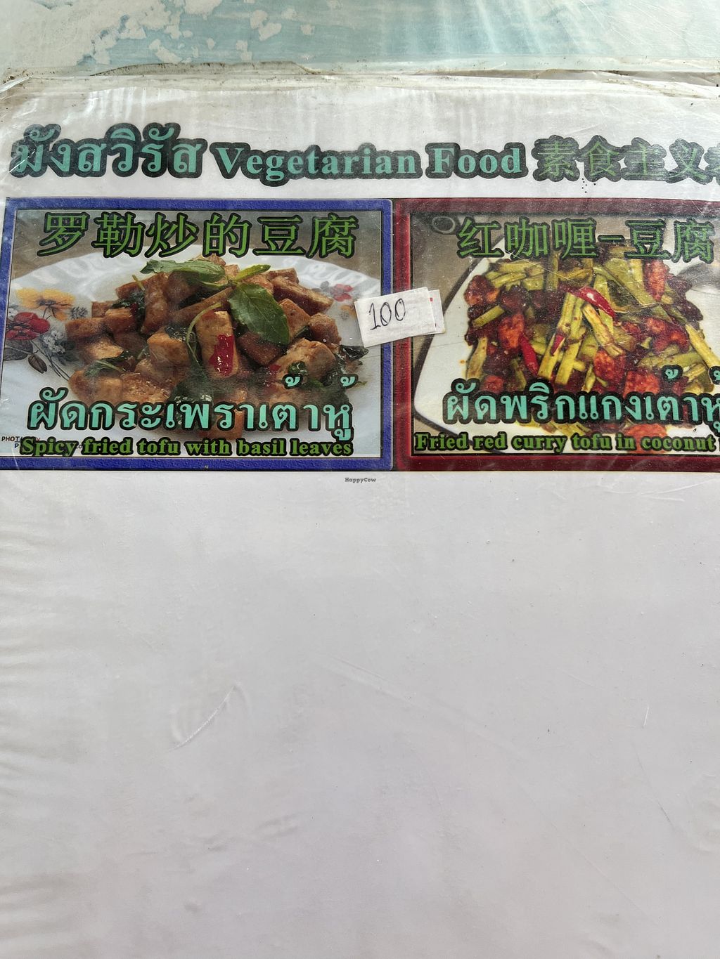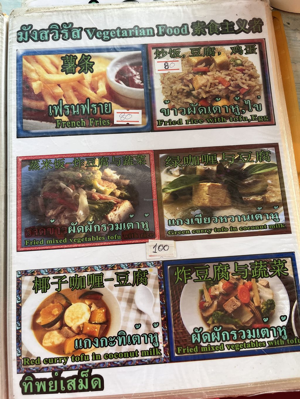 Serves meat, vegan options available. Local Thai restaurant with outdoor seating serving local dishes. Has a two page vegetarian/vegan menu but can also veganise other dishes. Offers dishes like fried rice, fried noodles, papaya salad, spring rolls, panang curry, green curry, pad Thai, spicy tofu with basil. Open Mon-Sun 8:00am-9:00pm.