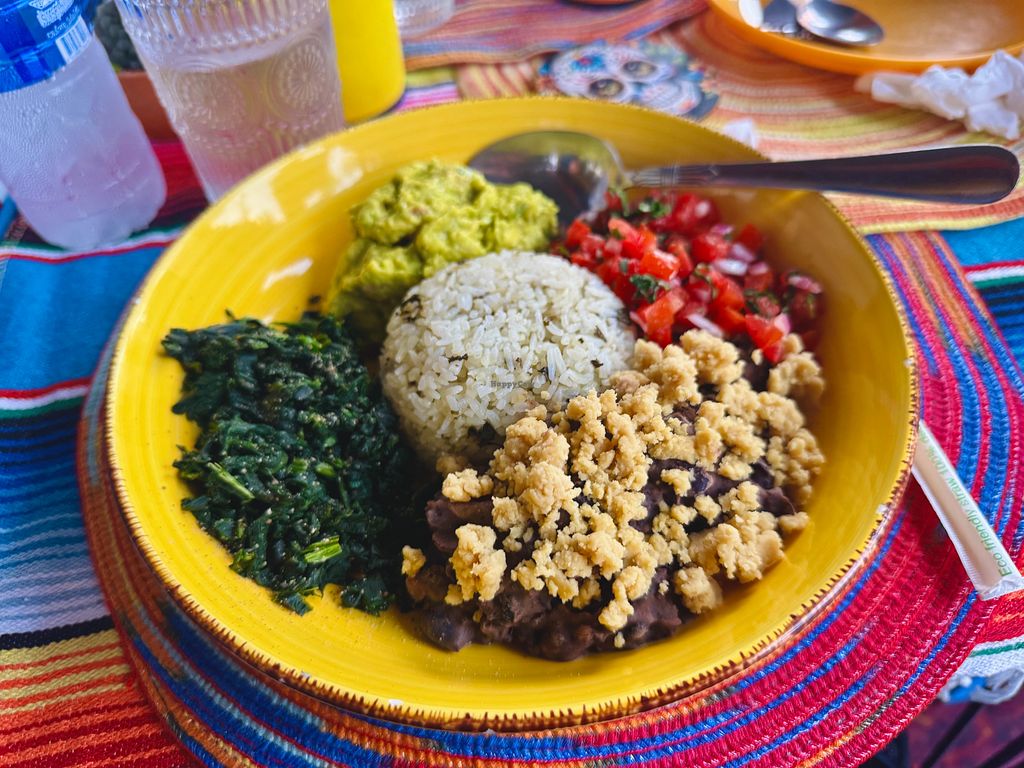 Delicious vegan buddha bowl with vegan cheese, spinach and guacamole.