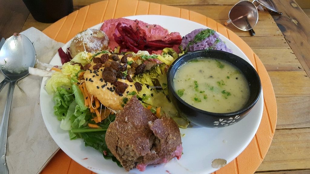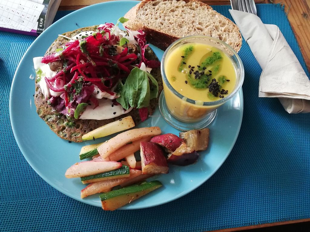 Pumpkin soup, baked veggies (sweet potato, zucchini and others). Flatb…