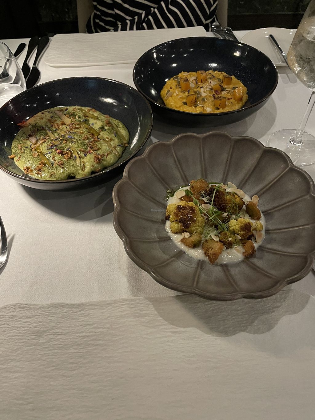 Serves meat, vegan options available. Mediterranean restaurant offering a dedicated plant-based menu with dishes such as pumpkin risotto, cauliflower prepared three ways, and asparagus dishes.