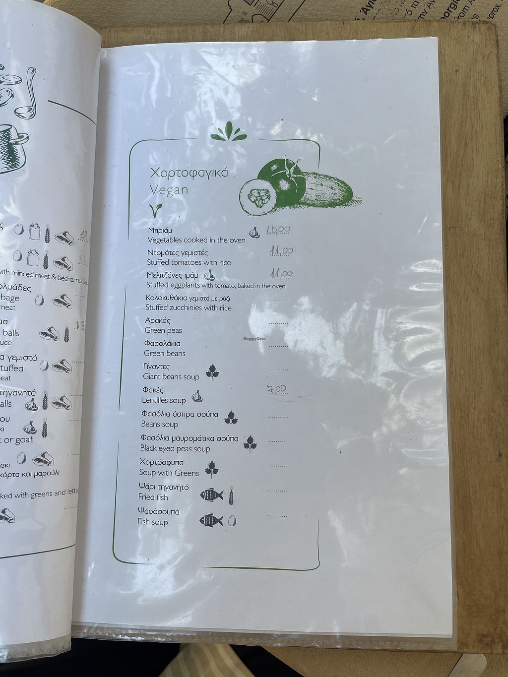 Vegan options marked with a green V