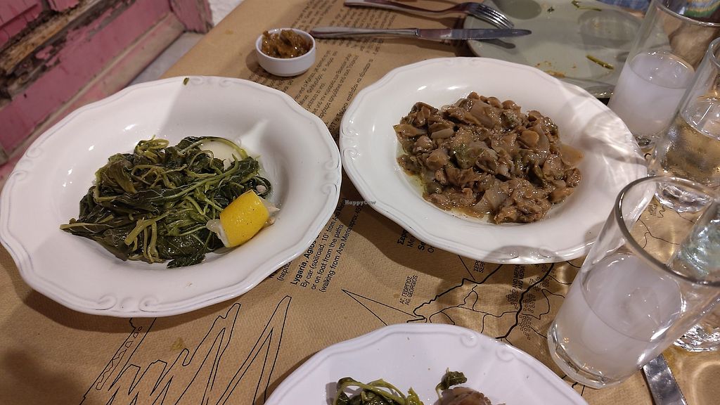 Horta salad and local capers in onion sauce. Plus complimentary melitz…