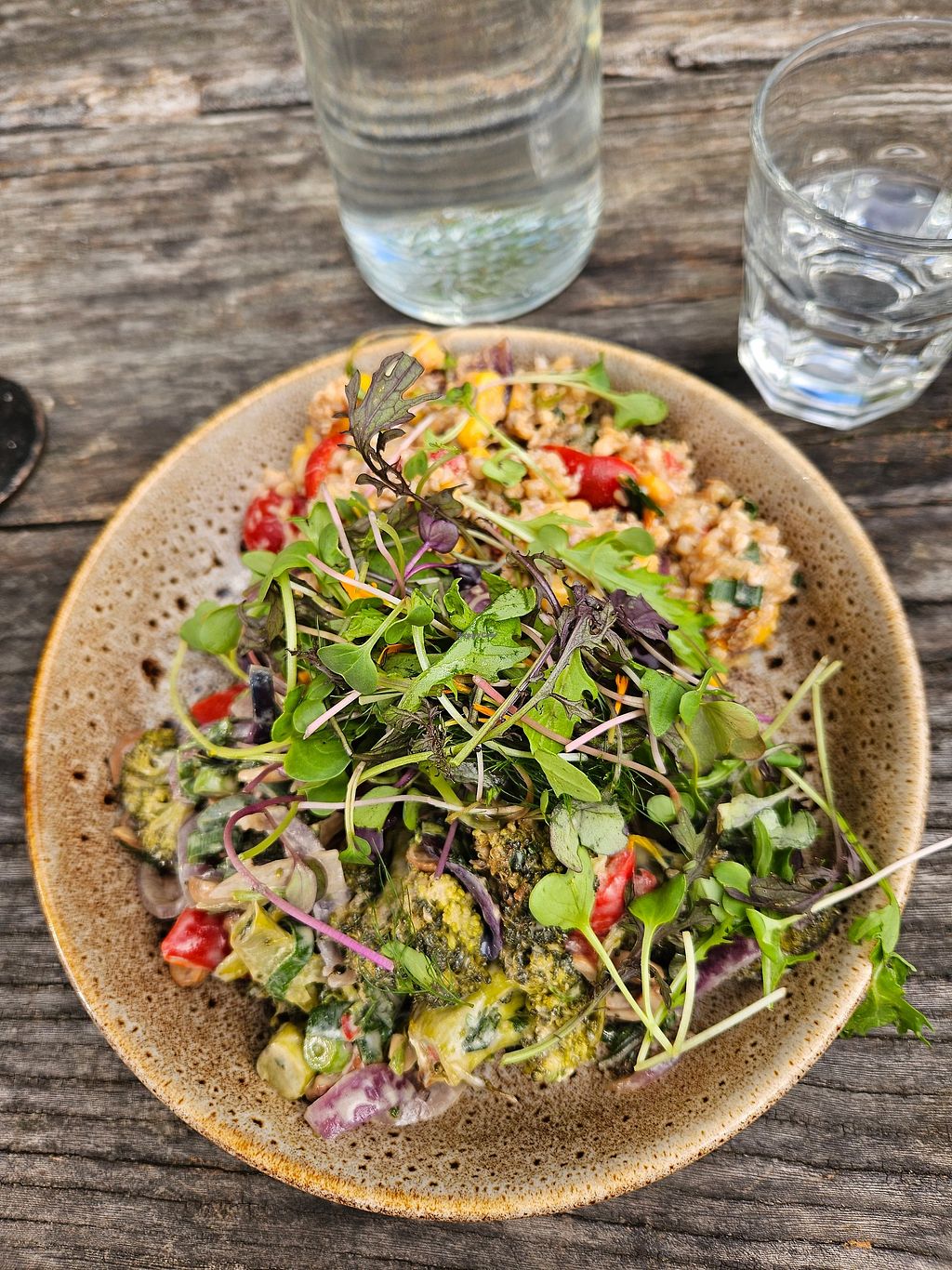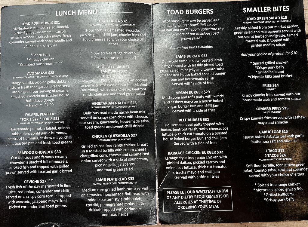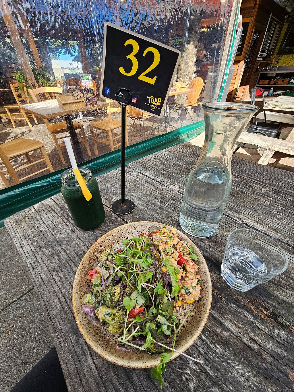Delicious lunch at Toad Hall. I had the vegan burger in a bowl - option to have in a bun or in a bowl without the bun. Served with the freshest salad, the lettuce tasted like it had just been picked from the garden. Finished with Manuka mint tea and a raw cookies and cream cake. Service ( from Jack 😊) was excellent.All the staff were friendly. Would definitely recommend and we will return.