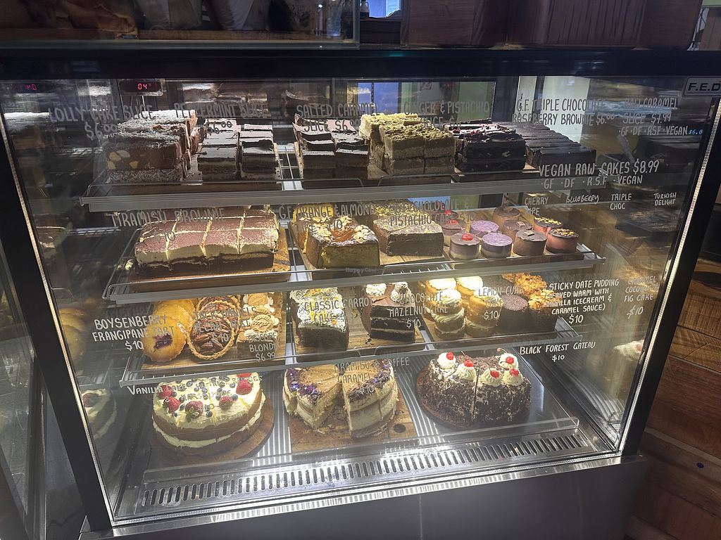 A few vegan options on the menu and in the cabinet, including a pie, various salad, raw slices etc, and there’s even a vegan real fruit ice cream option.