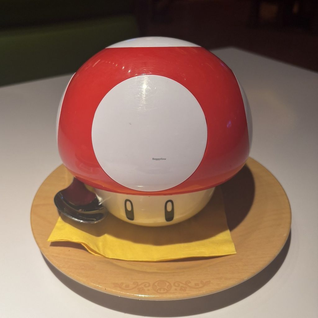 Serves meat, vegan options available. Chef Toad themed restaurant offering a vegan mushroom soup. Open Mon-Sat 8:30am-9:00pm, Sun 7:30am-10:00pm.