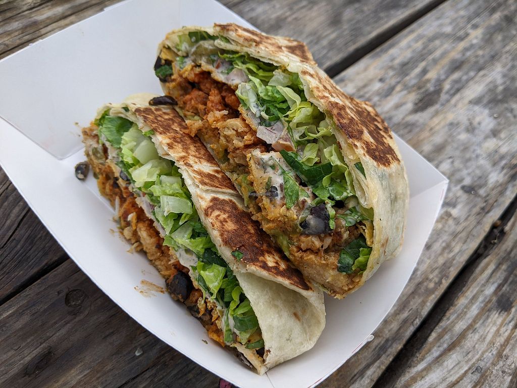 100% plant-based truck offering Mexican-inspired meals and sides. The Buffalo Chick’n and Cheeseburger Crunch Wraps were impressive - packed full of flavour and texture. The portion size is big. Wait time was long but we grabbed a drink and enjoyed the atmosphere.