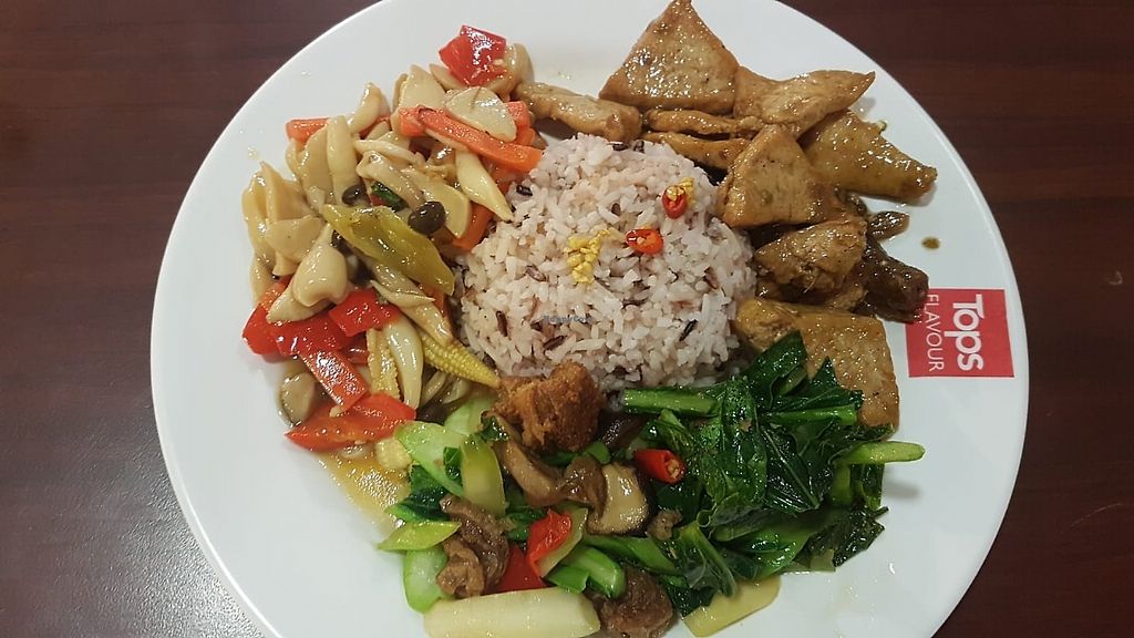 This is a vegan food stall in Tops supermarket which is the basement level of The Robinson Department Store. Go down the stairs from the street level into the supermarket (near McDonalds sign). This is the second stall as you enter. It is clearly marked Vegetarian. You need to buy a card at the cashier (return the card to get unused money). There were many types of tofu, mushrooms, noodles, vegetable dishes. I paid 55 Baht for a good sampling of the dishes. 5 baht extra to take out. I thought it was quite good. No English (but pointing worked well). Many Tops supermarkets have food courts, but this is the first time I've seen a vegetarian stall. If you eat often at the well-known veggie place on the 5th floor of Terminal 21, then this might be a nice change.