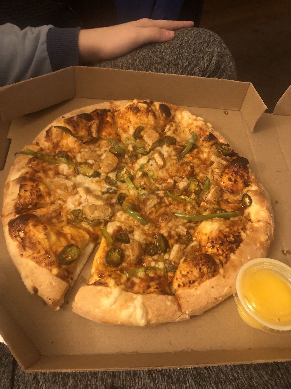 large - vegan cheese, banana peppers, vegan chicken (impossible)