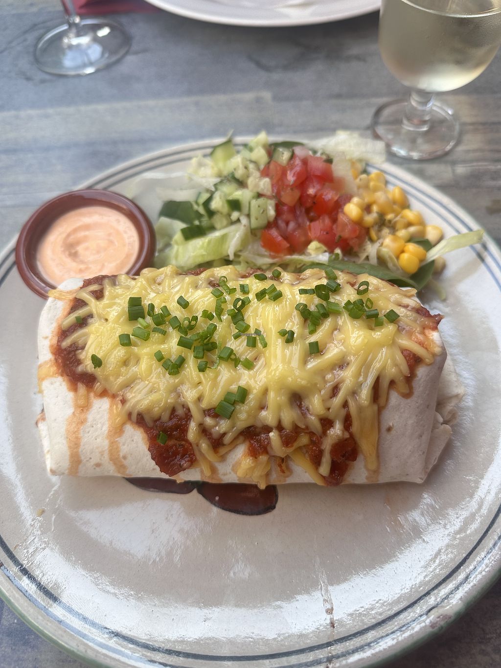 A nice restaurant with a cool Mexican Cantina vibe. I had the Avocado burger that came with fries and a small side salad. It was really good! Another veg option is a bean and rice burrito. Service was great. Good value.