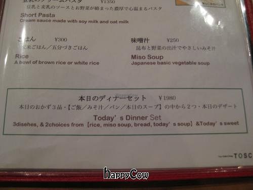 Had a great lunch at Tosca last week. Chose from the English menu and had the tofu set which was delicious - many small dishes, tofu in miso sauce with rice. My partner had the wheat gluten burger which was absolutely wonderful - came with all sorts of tasty toppings and a rice? flour bun.