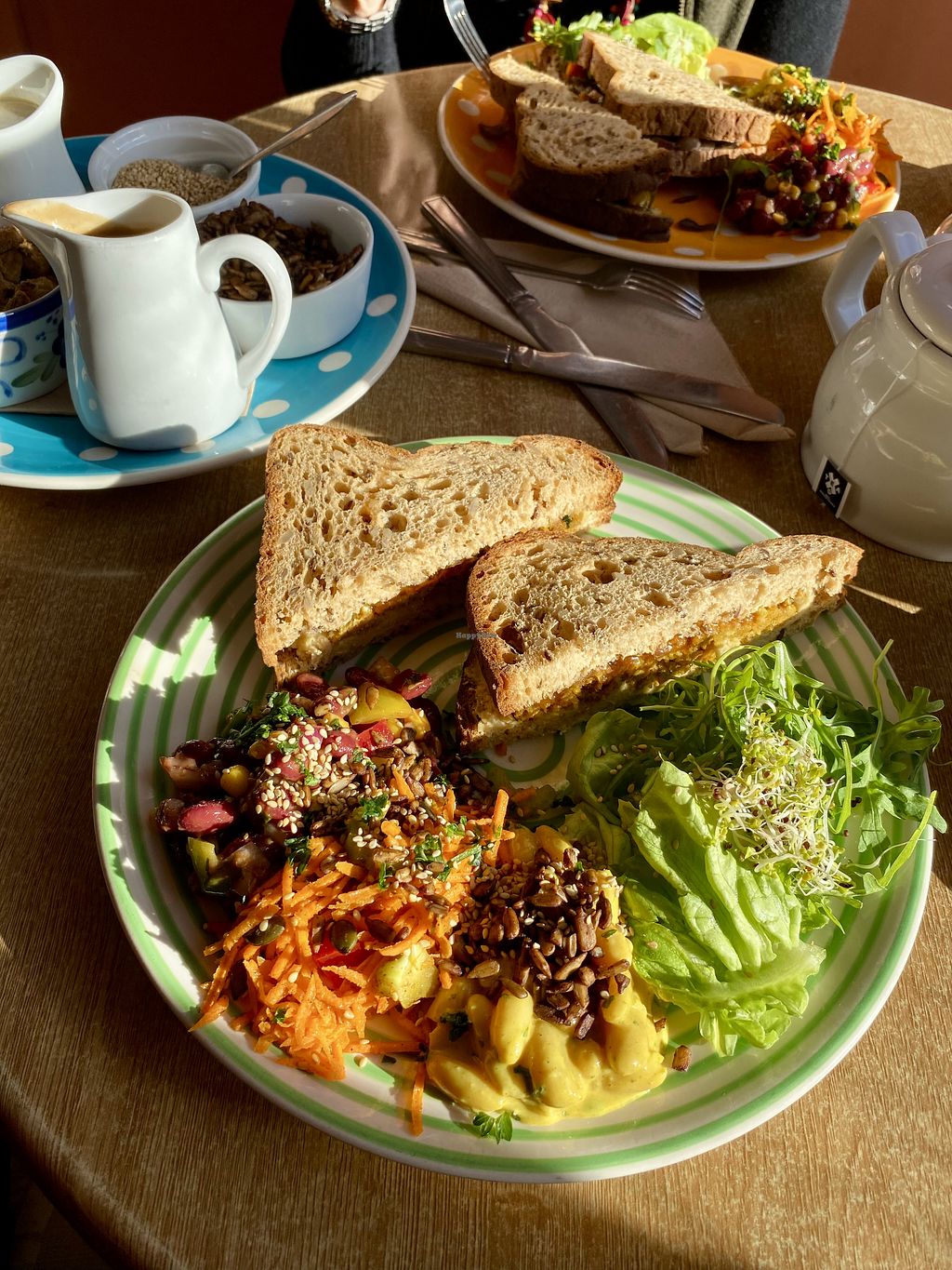 Had a delicious special of Indian-spiced carrot and spinach pie with a tasty selection of salads. Friendly service, lovely atmosphere.