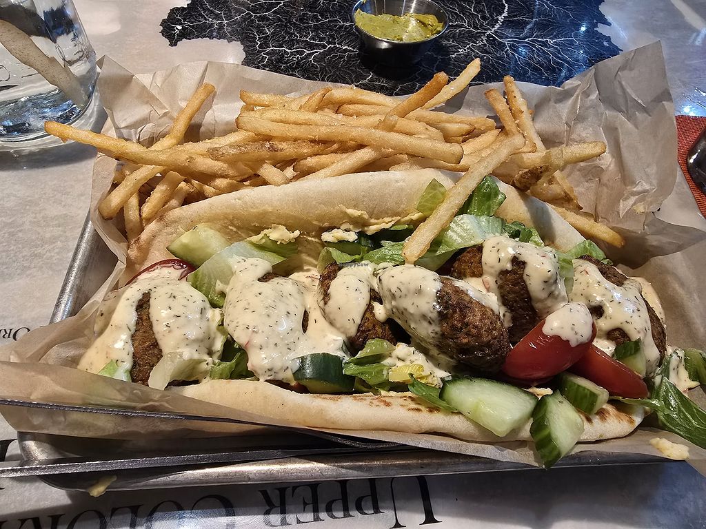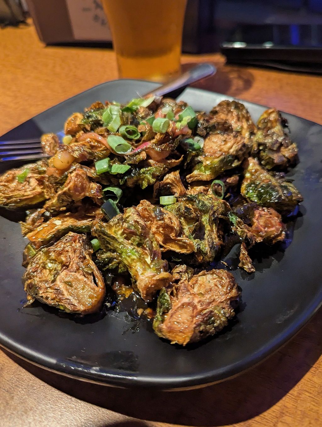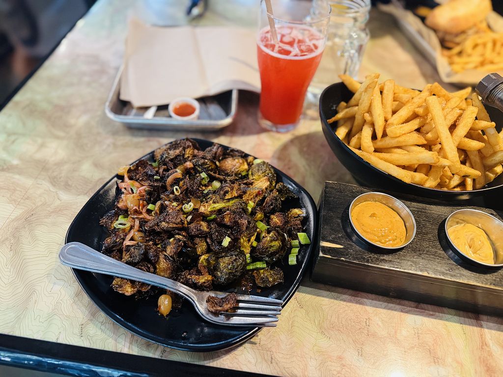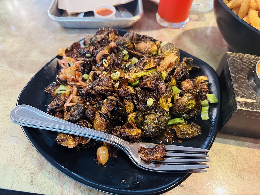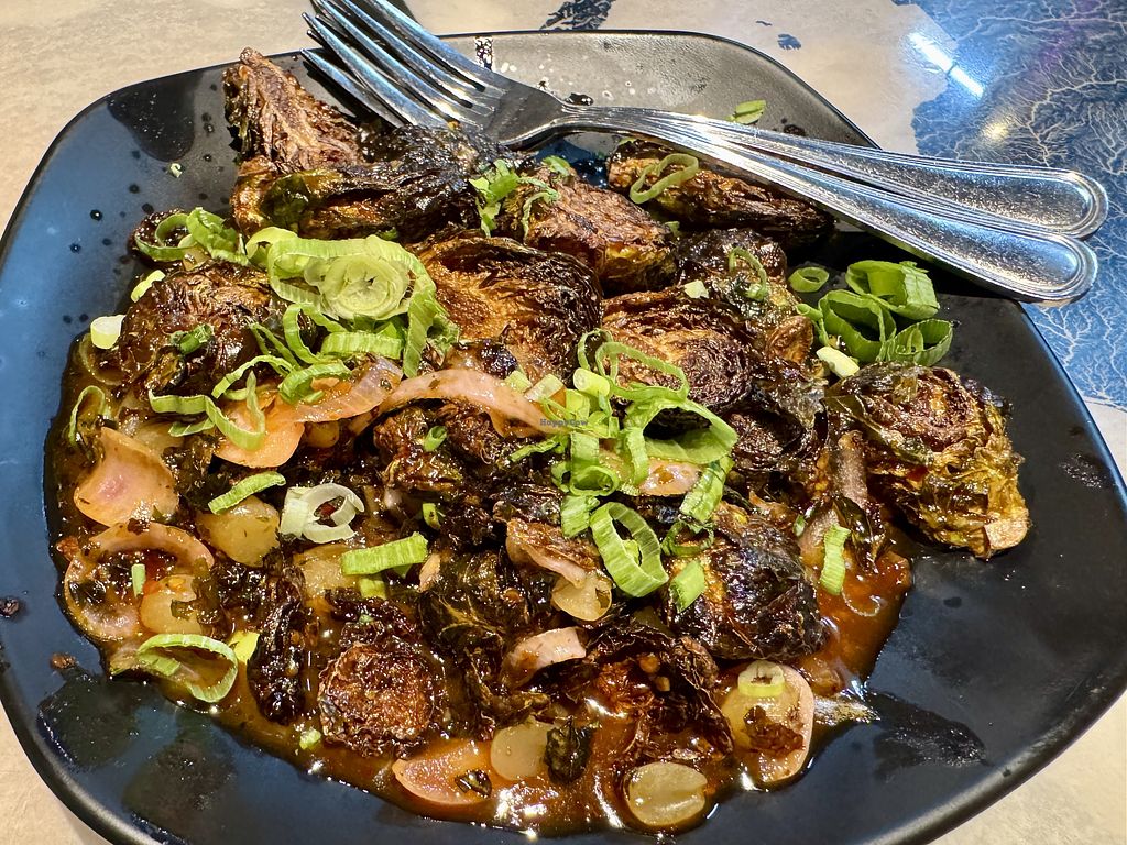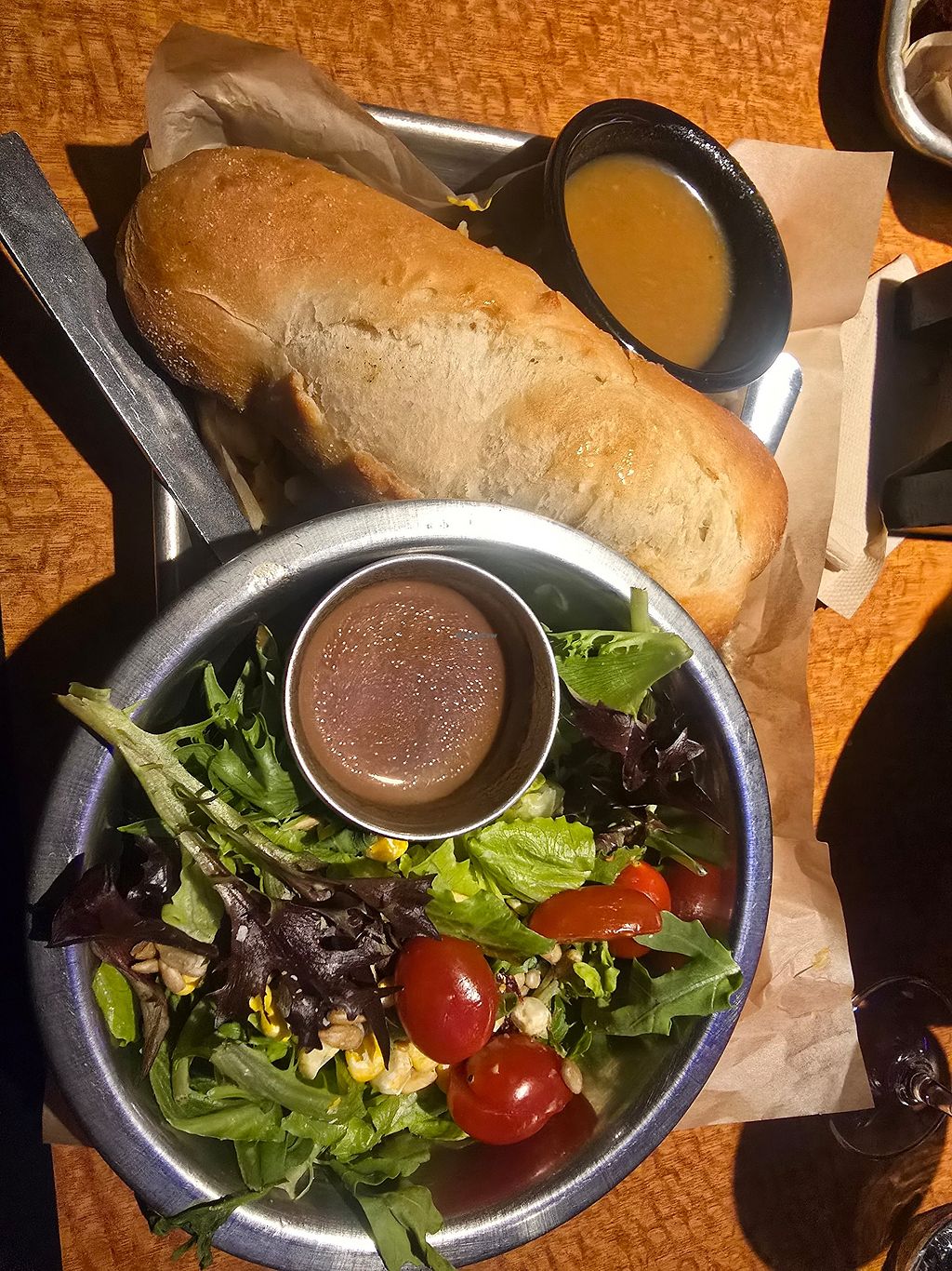 Vegan beet sandwich with side salad. Brussels sprout appetizer.