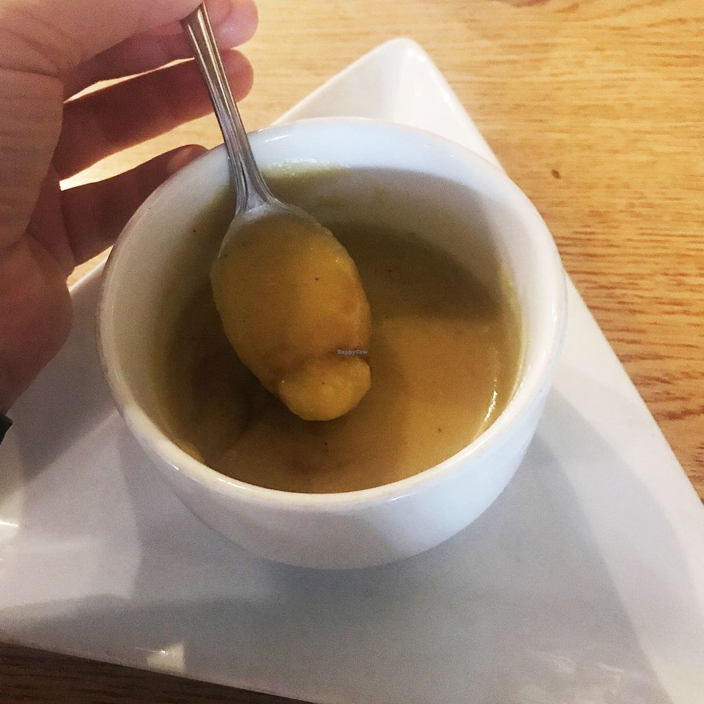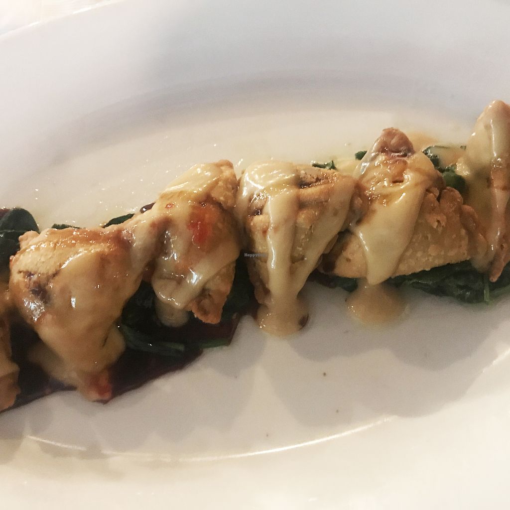 Second Course: Potato and Pea Samosas with Curry Sauce, Wilted Spinac…