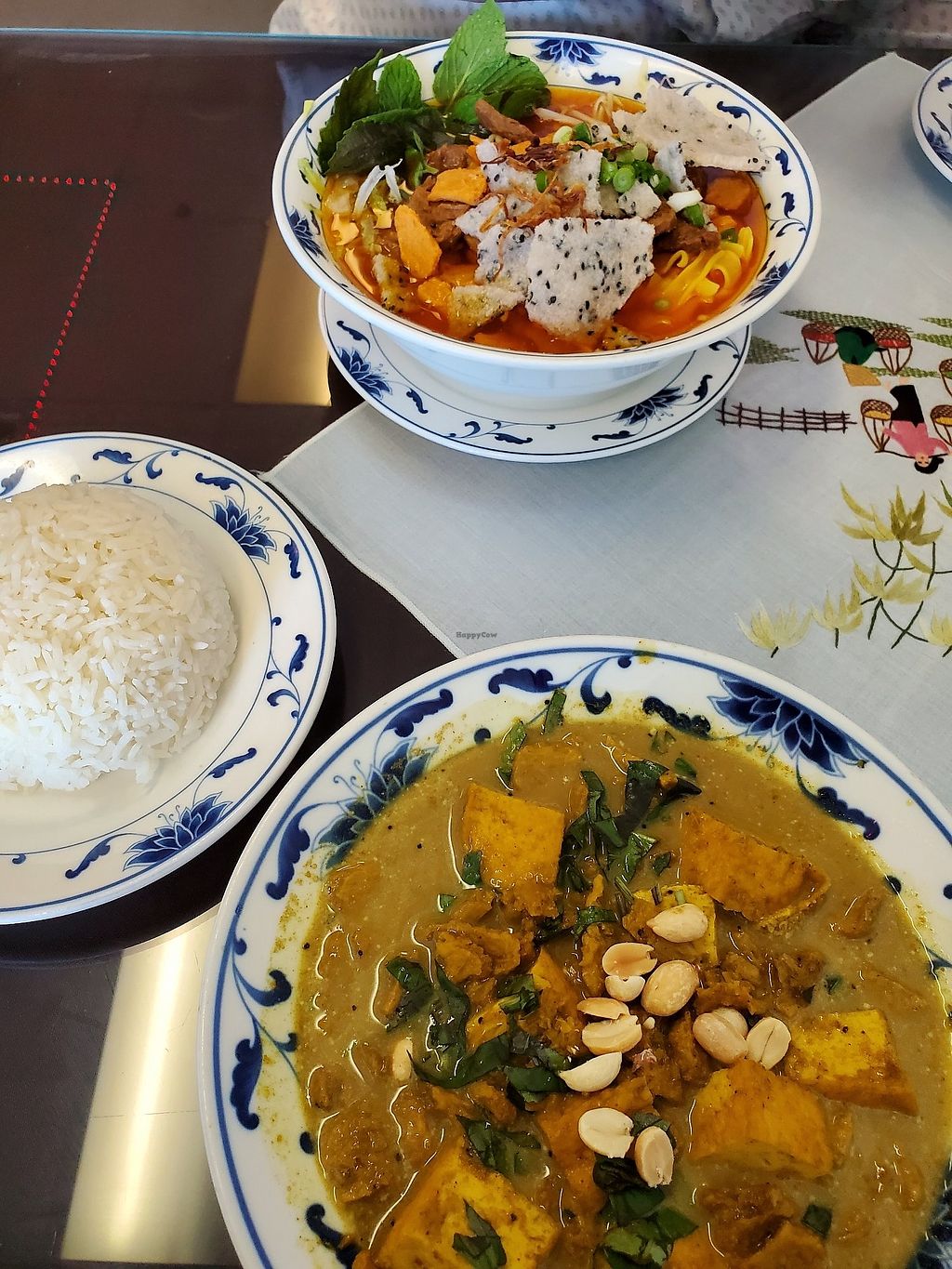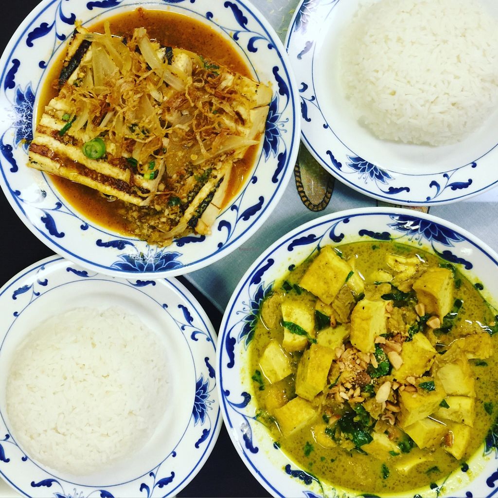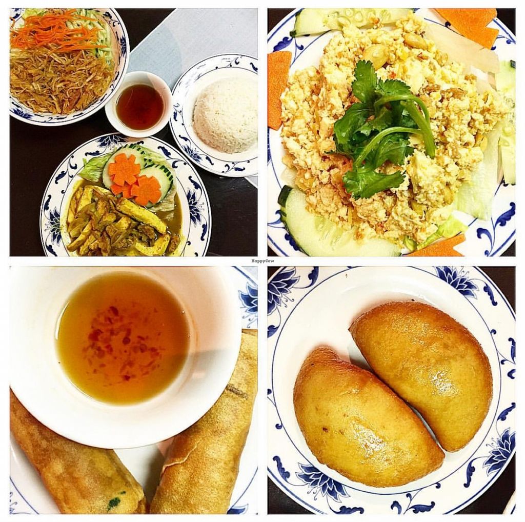 imitation chicken curry, tofu salad, spring rolls and crescent rolls.
