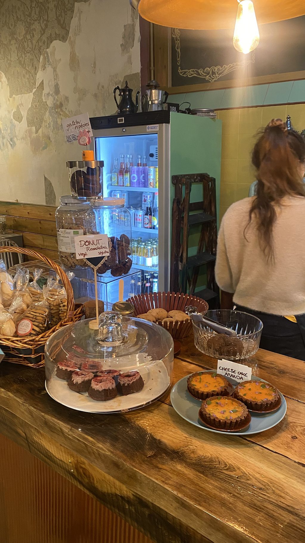 Diferentes postres-bollería vegana en una cafetería con diferentes leches veganas y variedad de tés.