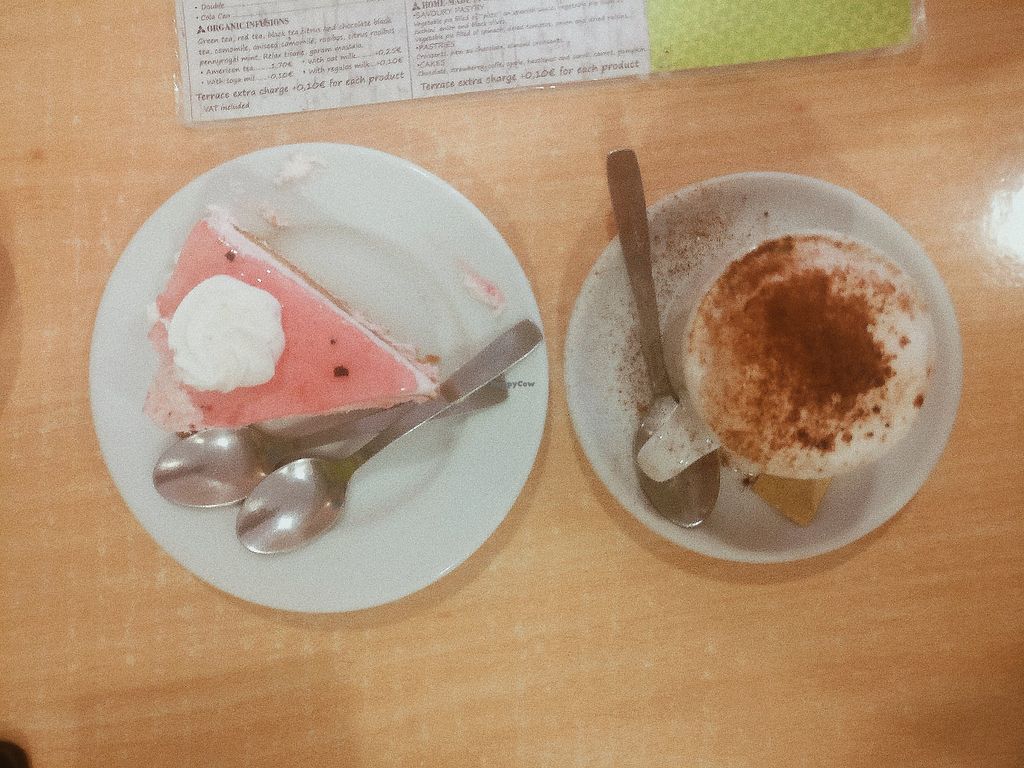 Strawberry cake and almond milk cappuccino