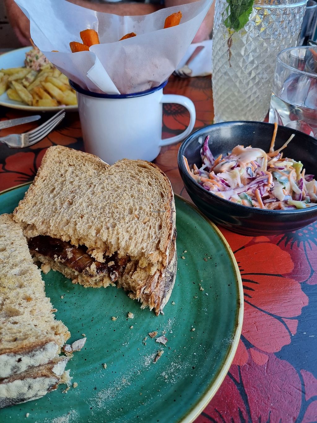 Sausage sarnie with slaw and sweet potato fries- delicious 😄