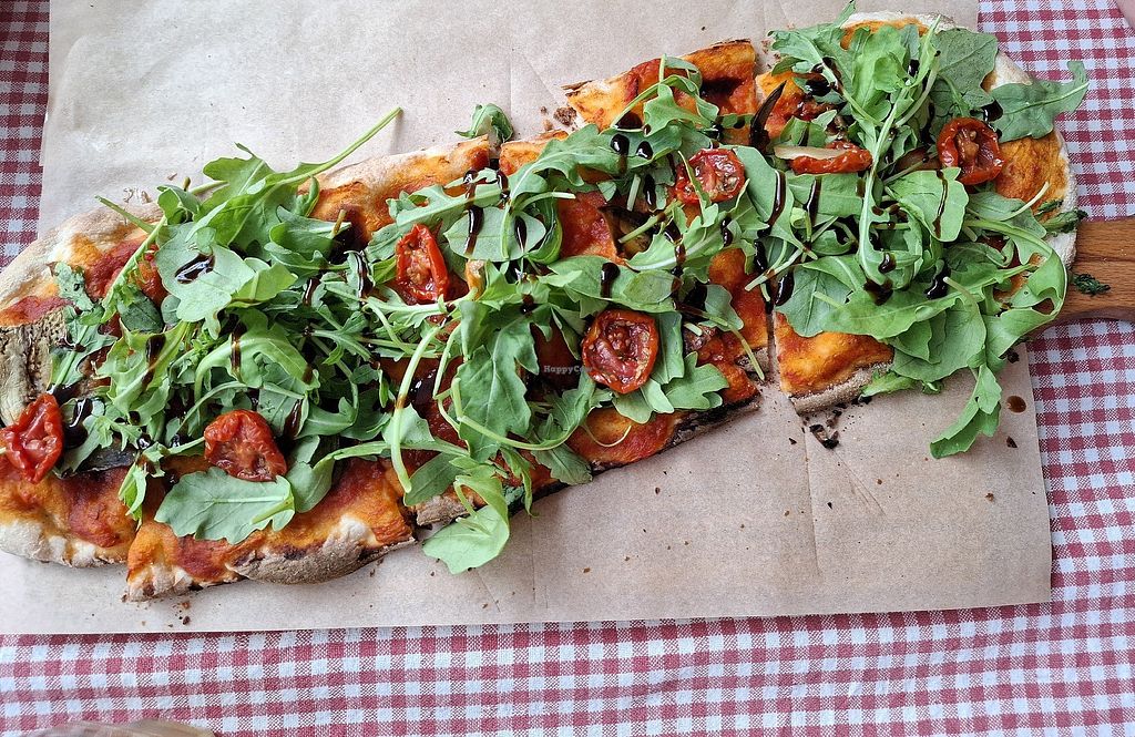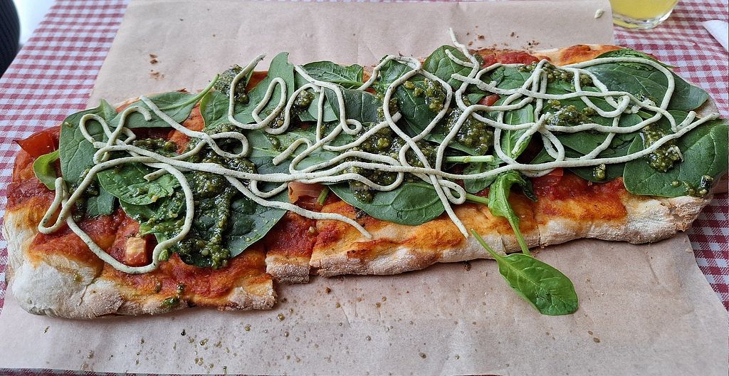 Divine pesto on pizza in the foreground. Nice insalata half eaten in b…