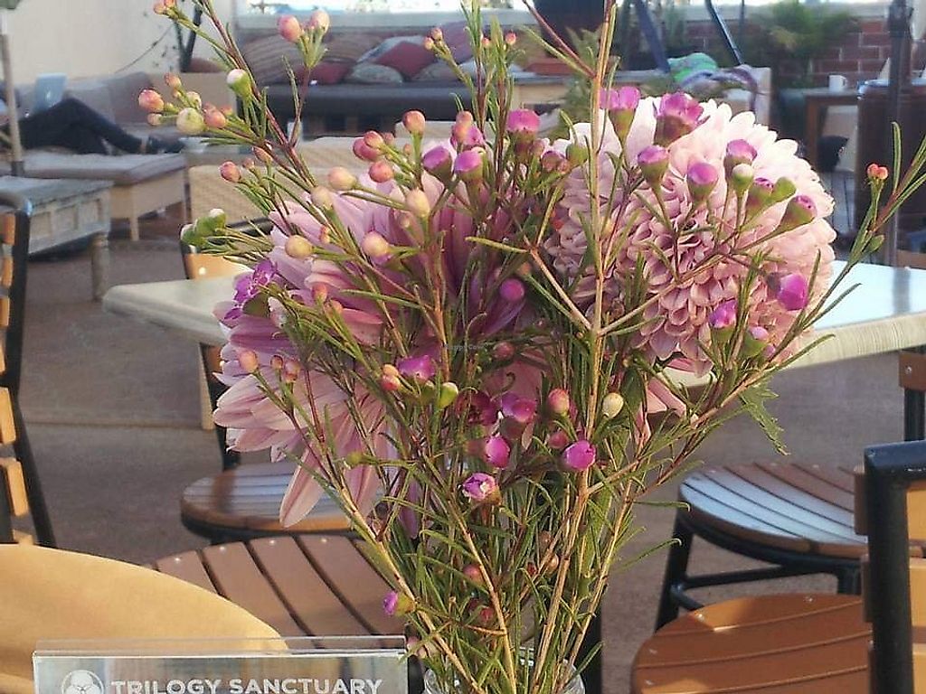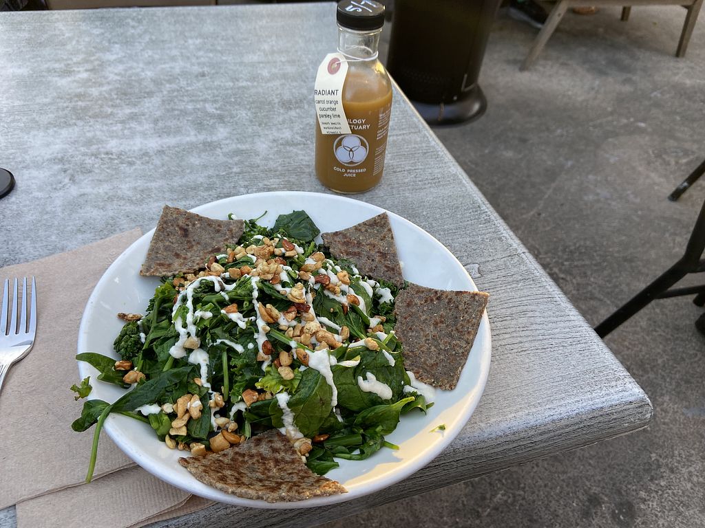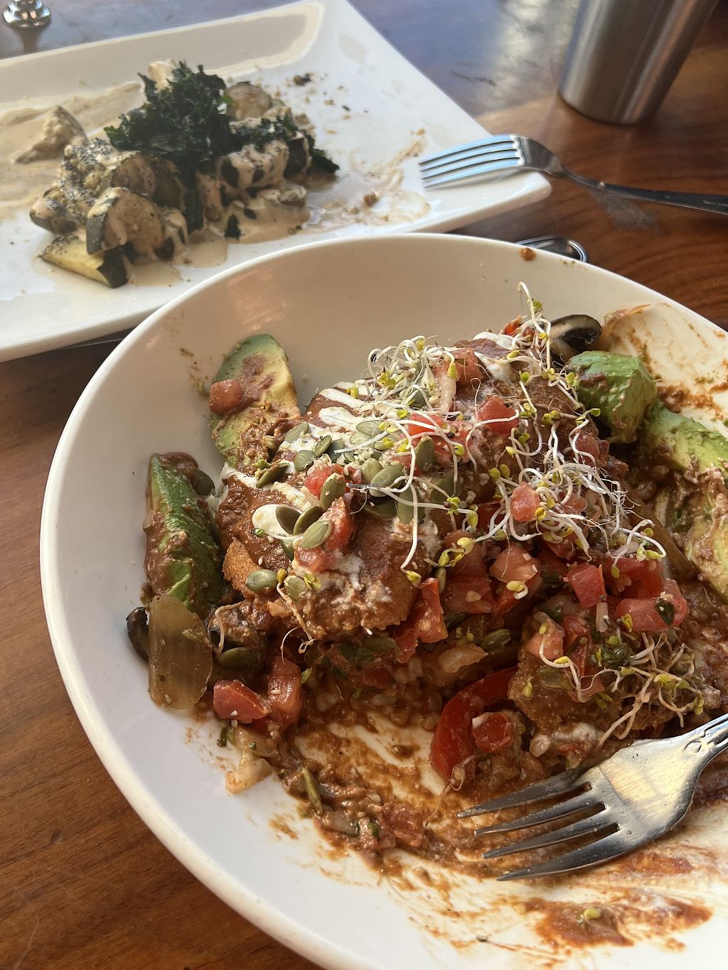 Eggs Benedict, glazed brussel sprouts and pitada and mango smoothie.
