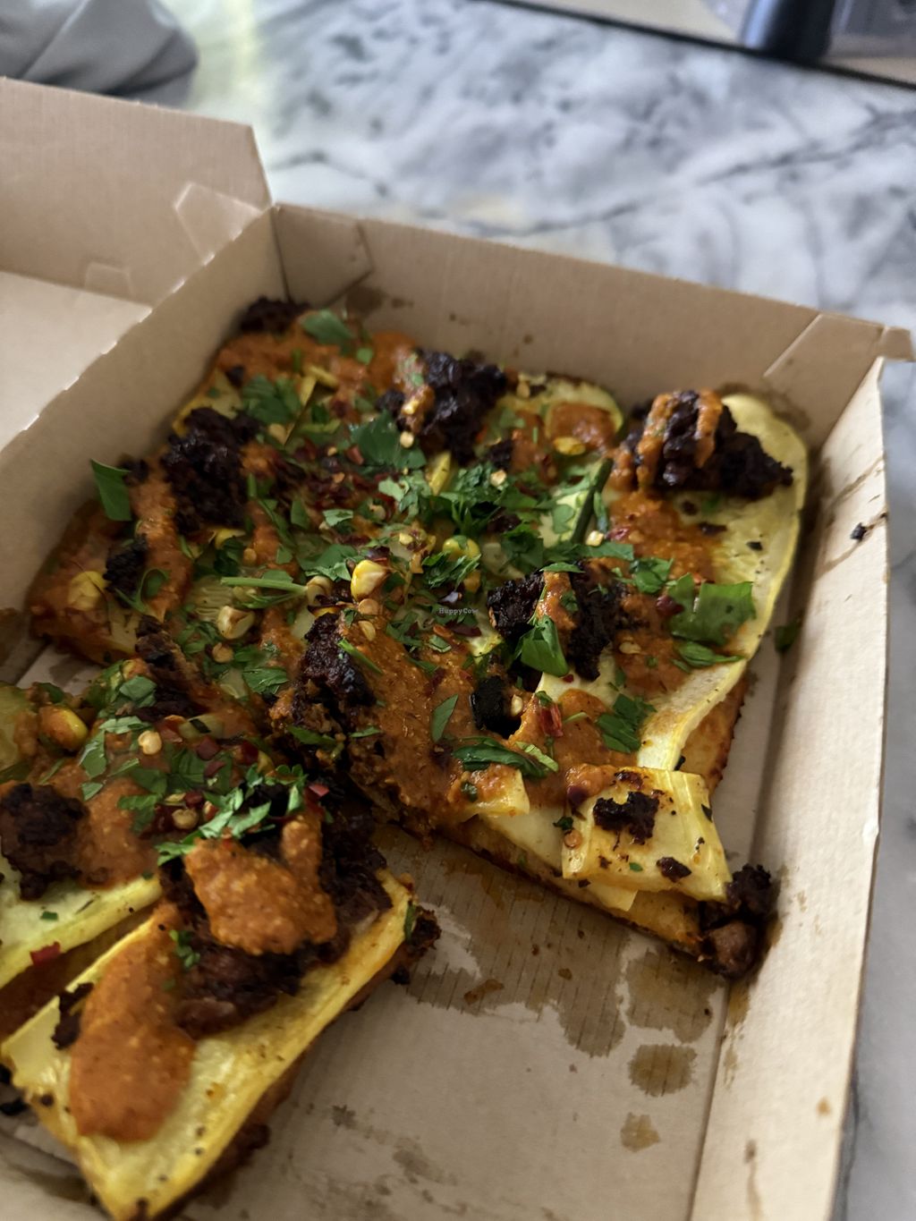 I stumbled upon this on my own. They have a soyrizo (chorizo) pizza with spices, herbs, and the perfect crispy flatbread.