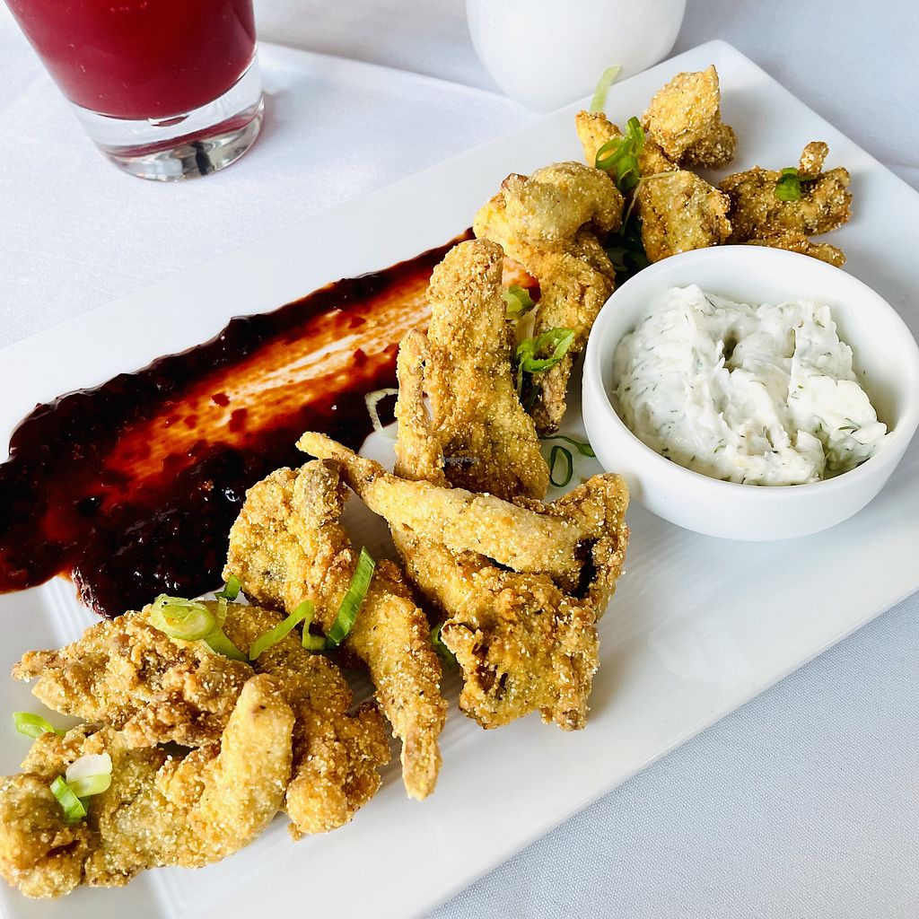 Crispy Oyster Mushrooms. guajillo chili sauce, horseradish-dill aioli