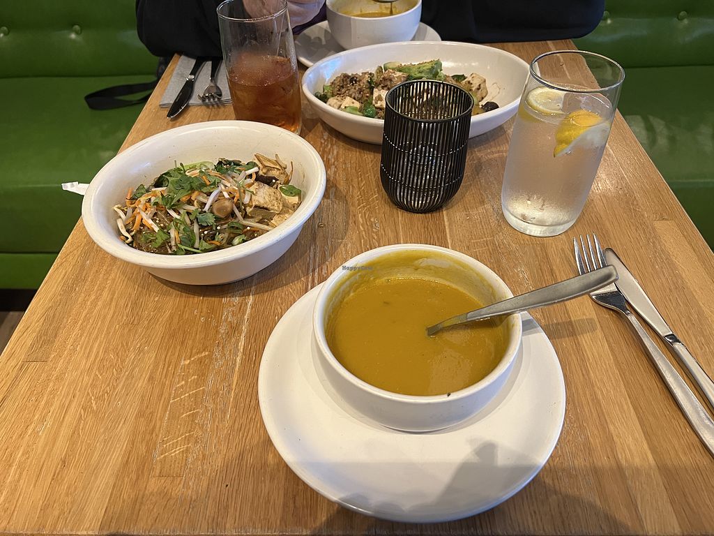 I had the noodle bowl with tofu with butternut squash soup. The soup tasted so fresh with layered spicing. The Korean glass noodle bowl smelled and tasted full of flavor with lots of tofu. I told the wait person that I was vegan and they were also. Super helpful. Menu clearly marked vegan versus vegetarian. Partner had the quinoa bowl and enjoy his too.