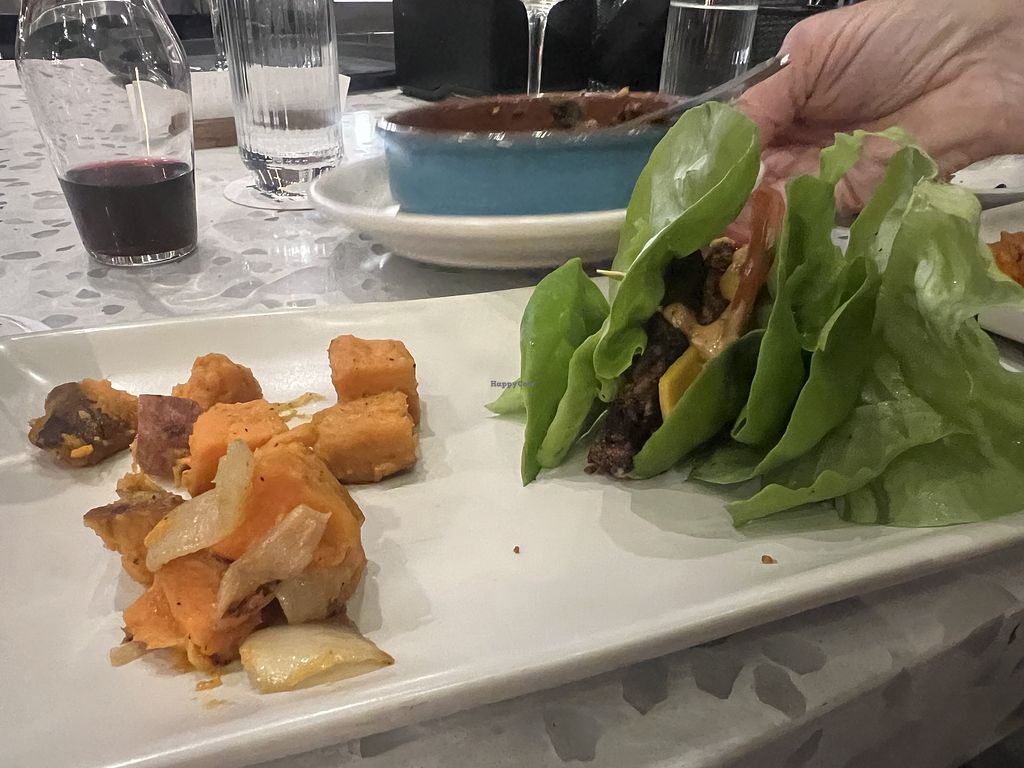 Vegan veggie burger with roasted potatoes