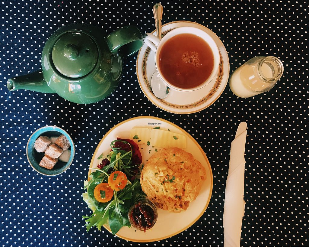 Yorkshire tea with oatmilk and a savory scone