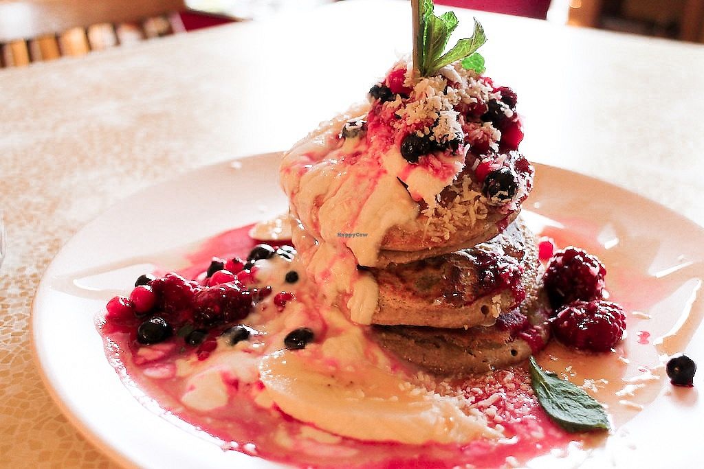 Banana breakfast pancakes with berries and yoghurt